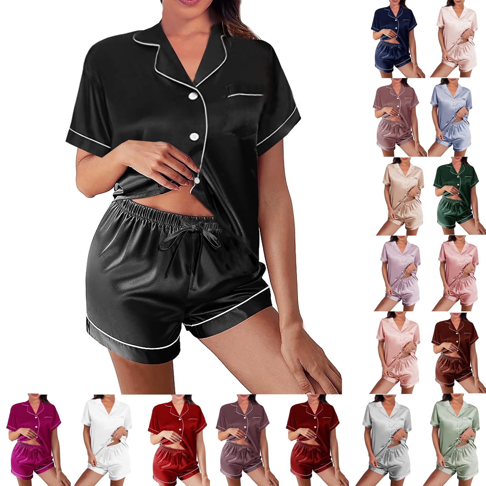 Product Features:Two Piece Pajama Set featuring classic sleepwear style.Short sleeve sleepwear top and pajama shorts set. Premium ultra soft silk satin material in very high quality and this sleep set with superior stitching and perfectly-lined hems. Breathable and Comfy sleepwear set. Wash Care: Hand wash separately in cold water is recommended.