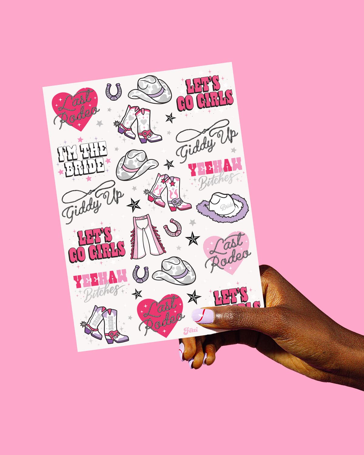Howdy Y'all?! Strut your way into a super cool bach party with this colorful set of temporary tattoos! 2 sheets totaling 48 tats means there's one for everyone - no cowgirl gets left behind :) Elevate your party with these tattoos that feature all sorts of fun bach designs: last rodeo, giddy up, horseshoe, boots + more! Party tested + approved... our tattoos will last day into night - so saddle up and get ready for the ride of your life!