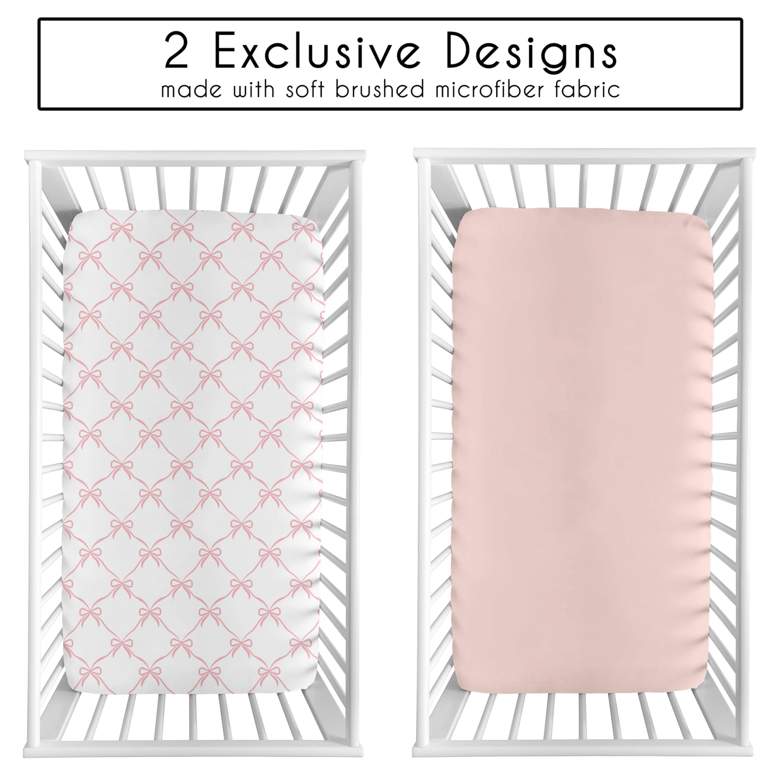 SNUG FIT: Includes: (2) Baby Crib Sheets: 52in. x 28in. x 8in. Our newborn standard crib sheets fit snugly, with premium elastic sewn around the entire bottom edge for a secure fit on most standard sized cribs and toddler beds, to reduce shifting & bunching. This microfiber cribsheets set features an exclusive design of a solid pink paired with blush and white elegant, shabby chic, ballerina, ballet dancer, princess bows print & is gentle on delicate skin to foster a soothing sleep environment.