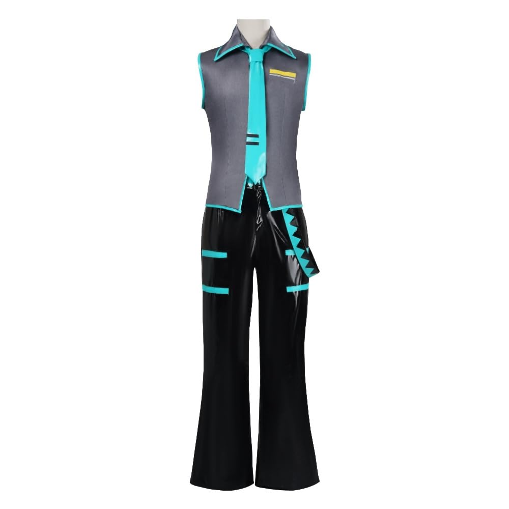 DESIGN:It is made of smooth and lustrous black synthetic fiber fabric, with a main body in black and a blue-green tie, decorated with fine stripes. The yellow and black logo on the chest adds a visual highlight. The sleeves feature a colorful checkered pattern with distinct layers. Tech-savvy .