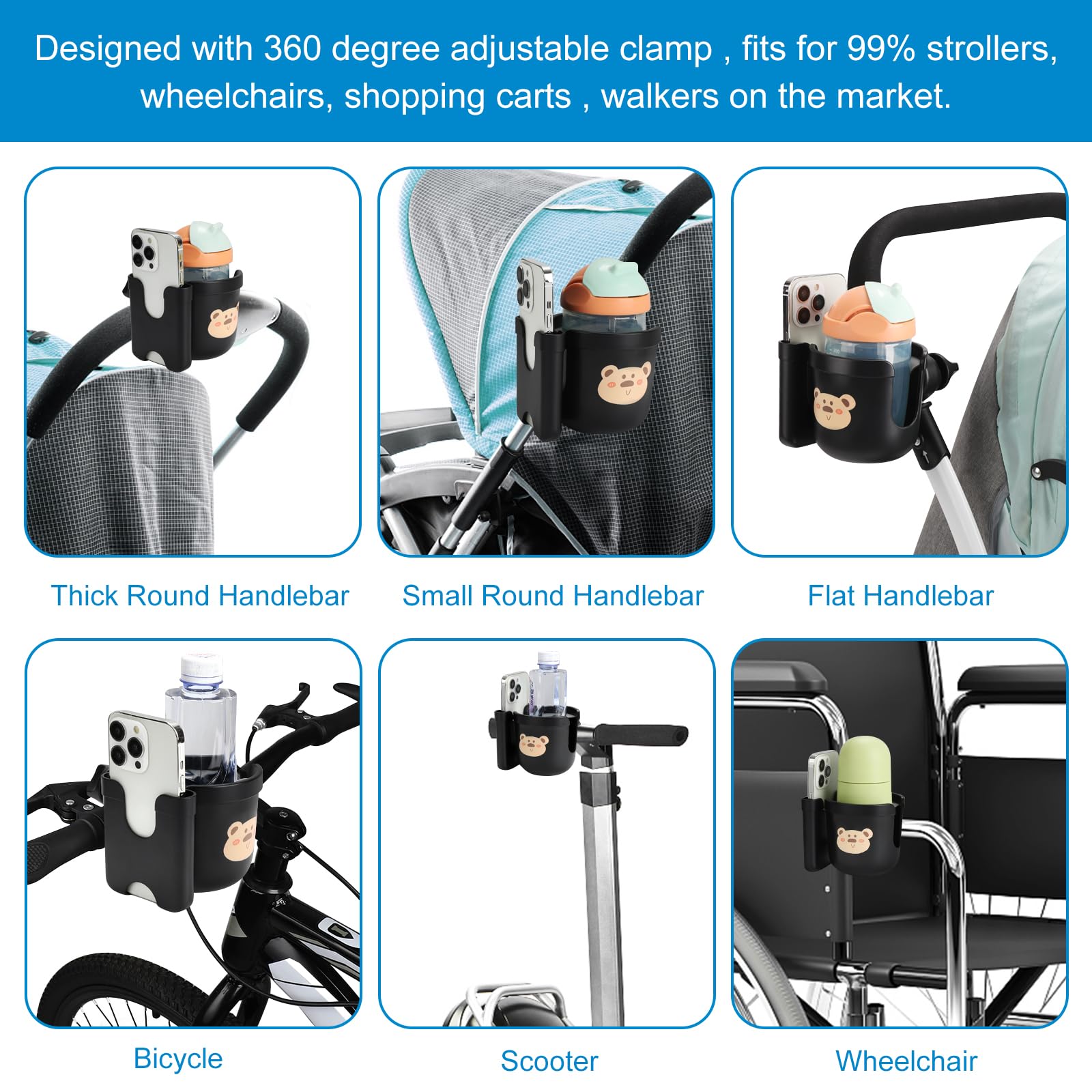 This wheelchair cup holder with phone holder fits for most walkers, wheelchair, scooter, rollator, bicycle, boat handle bar, shopping cart, kayak, ATV, lawnmowers, motorcycle, treadmill etc.