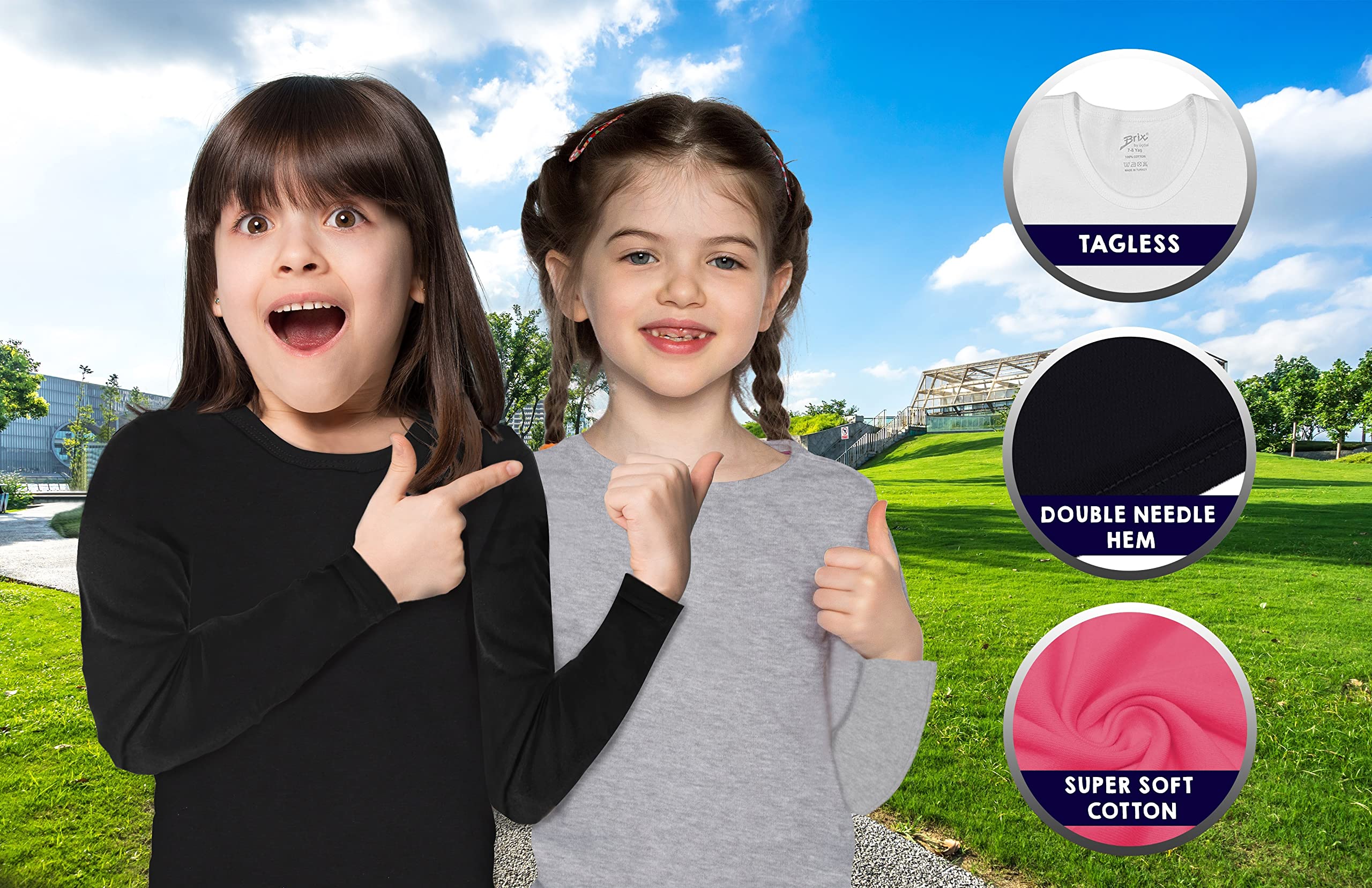 Basic 100% Cotton Toddler and Girls Crewneck Long Sleeve T-Shirts. Slim Fit - Multipack Value of 4 Tees - Sizes 2 Years - 14 Years
