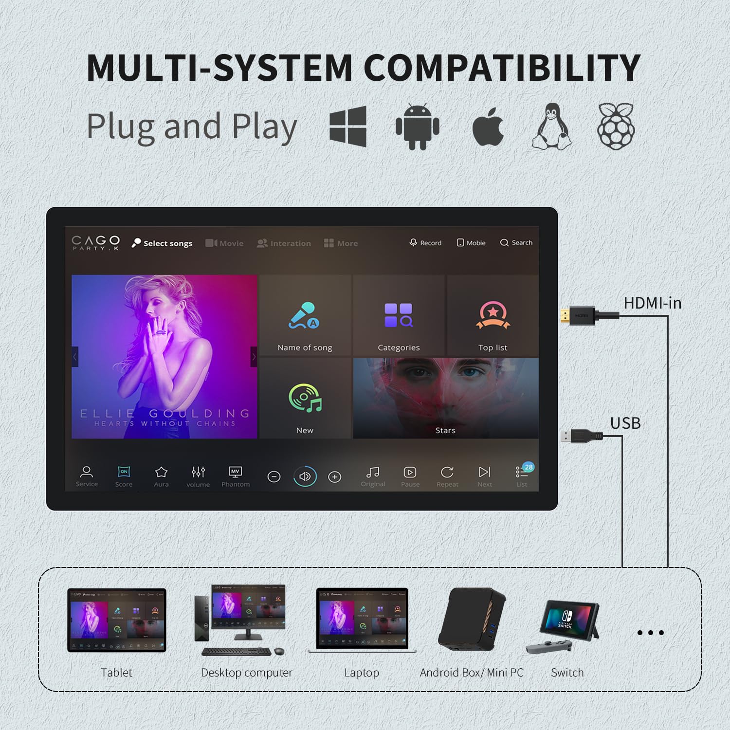 Easy to Use & Wide Compatibility: function of touch can work with Win XP/7/8/10/11, Mac os, Android, Linux, Raspberry Pi, plug and play by USB cable, also have VGA & HD-MI input ports, built-in speaker and 3.5mm Audio jack
