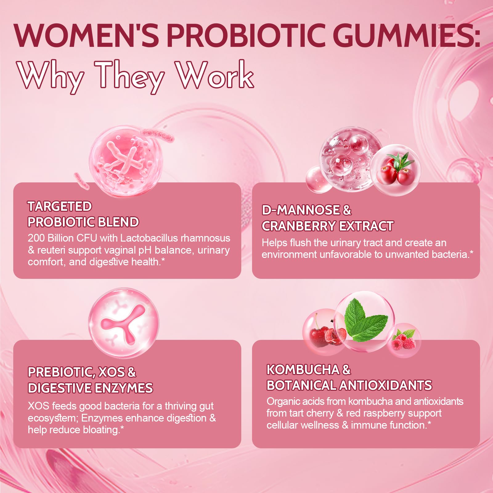 [Urinary Tract Health Support] Fortified with D-Mannose and Cranberry Extract, paired with women-specific strains (Lactobacillus rhamnosus & Lactobacillus reuteri), this formula targets urinary discomfort and maintains a healthy vaginal microbiome*