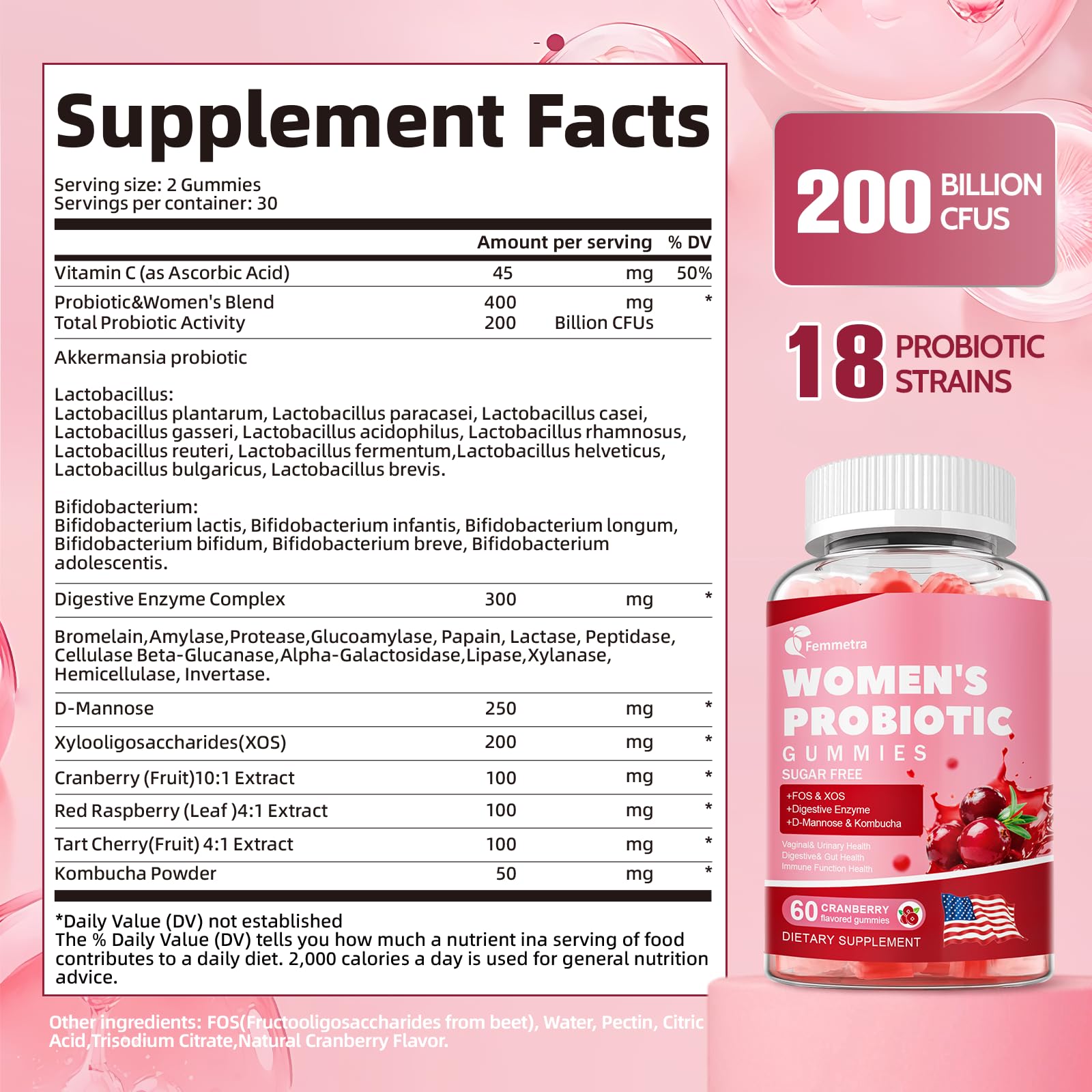 [High Potency & Quality Assurance] 18 diverse probiotic strains plus prebiotics (FOS/XOS) to extend strain viability, with 60 gummies per bottle (a 30-day supply) to support consistent daily use, backed by Femmetra’s quality standards