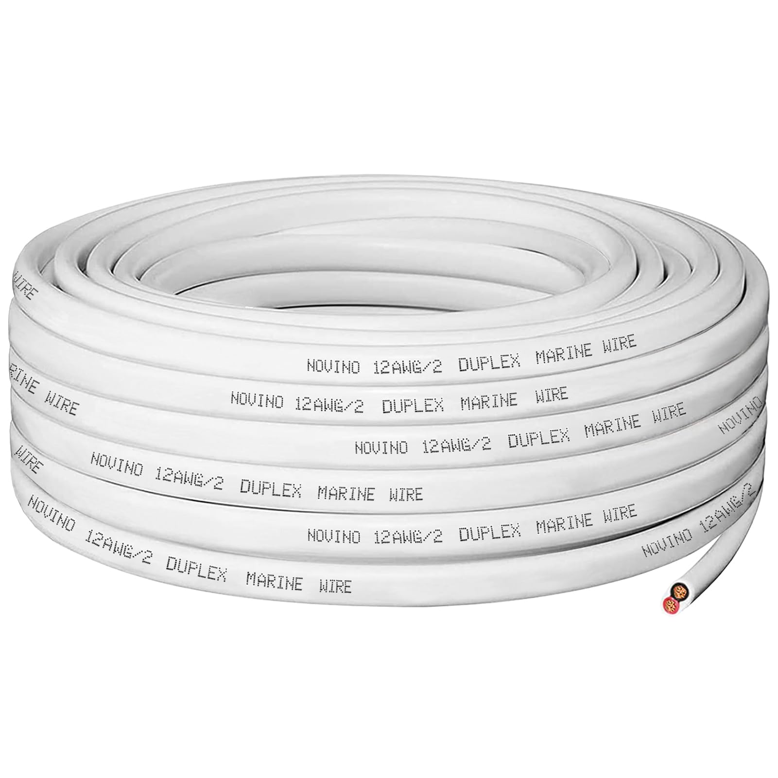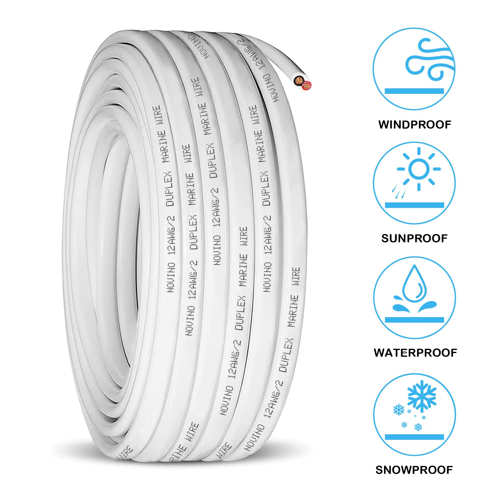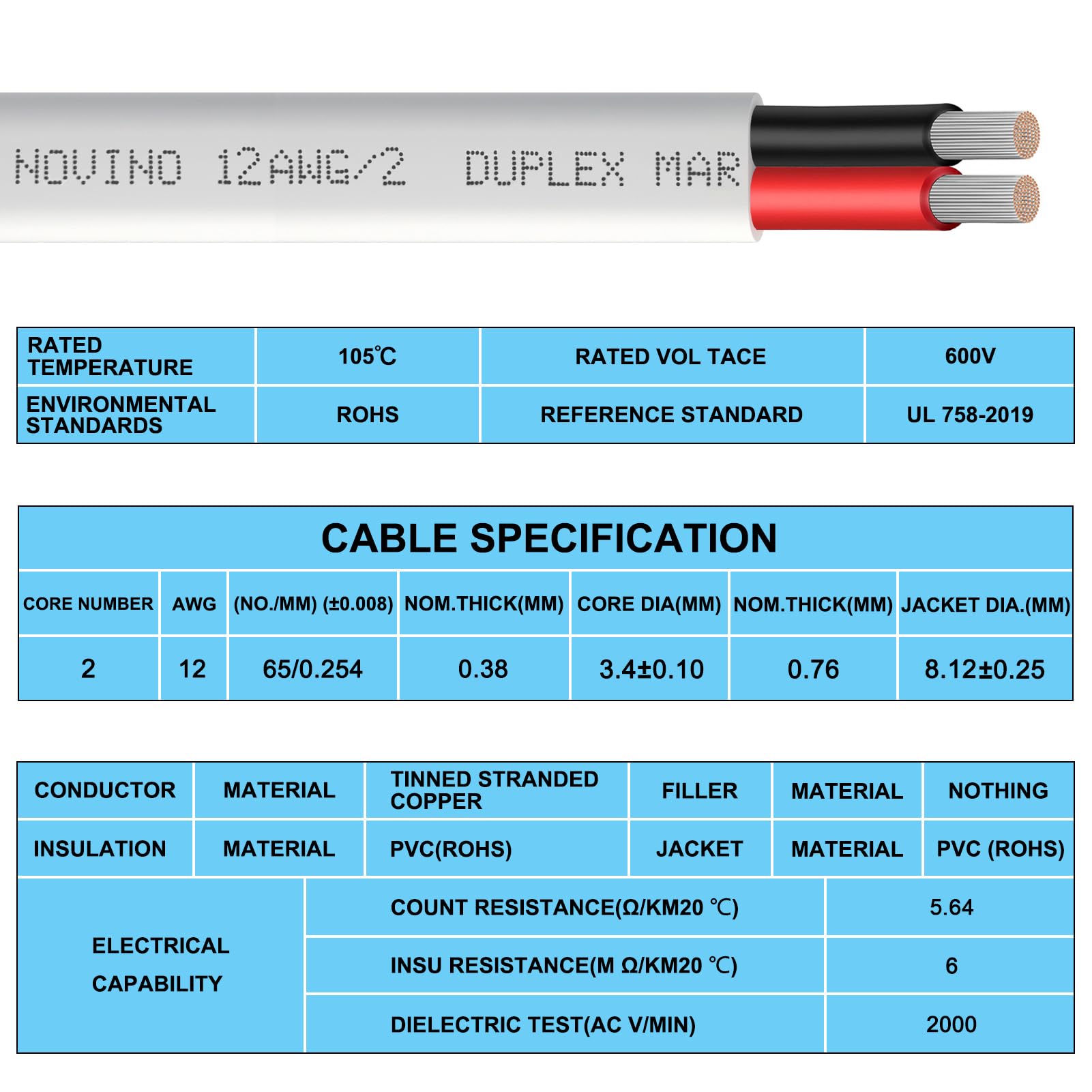Marine wiring Spec:white PVC jacket, red&black conductor sheaths, tinned & stranded True 12 AWG 12/2 flat copper wire,12 awg wire is insulation rated to 600v, 105 degrees C dry, and 75 degrees C wet