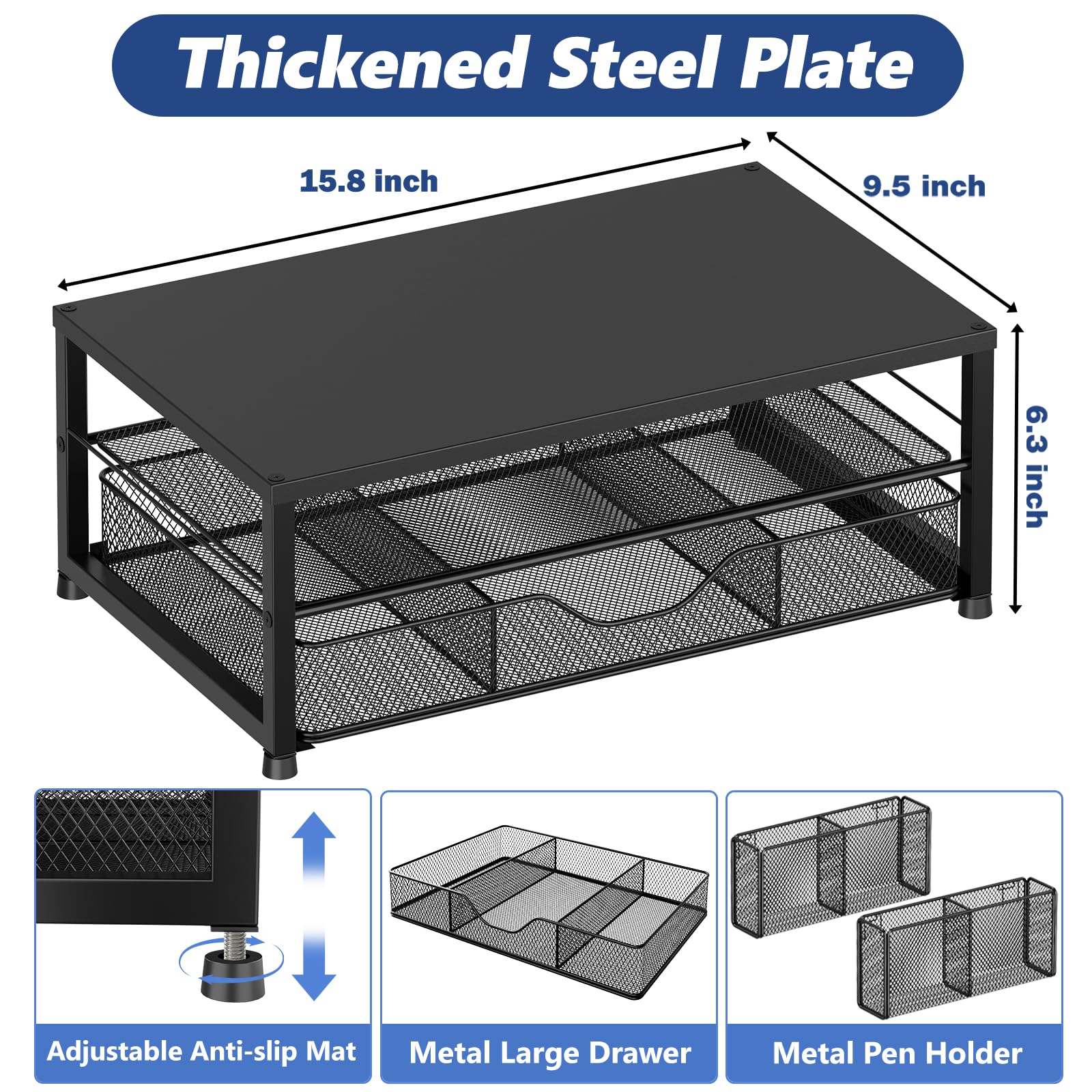 【Save Space】:This 2-Tier monitor stand with drawer and 2 hanging pen holders provides ample storage space to keep your office supplies and office desk accessories neatly organized and easily accessible, keeping your workspace tidy and improving your sense of well-being