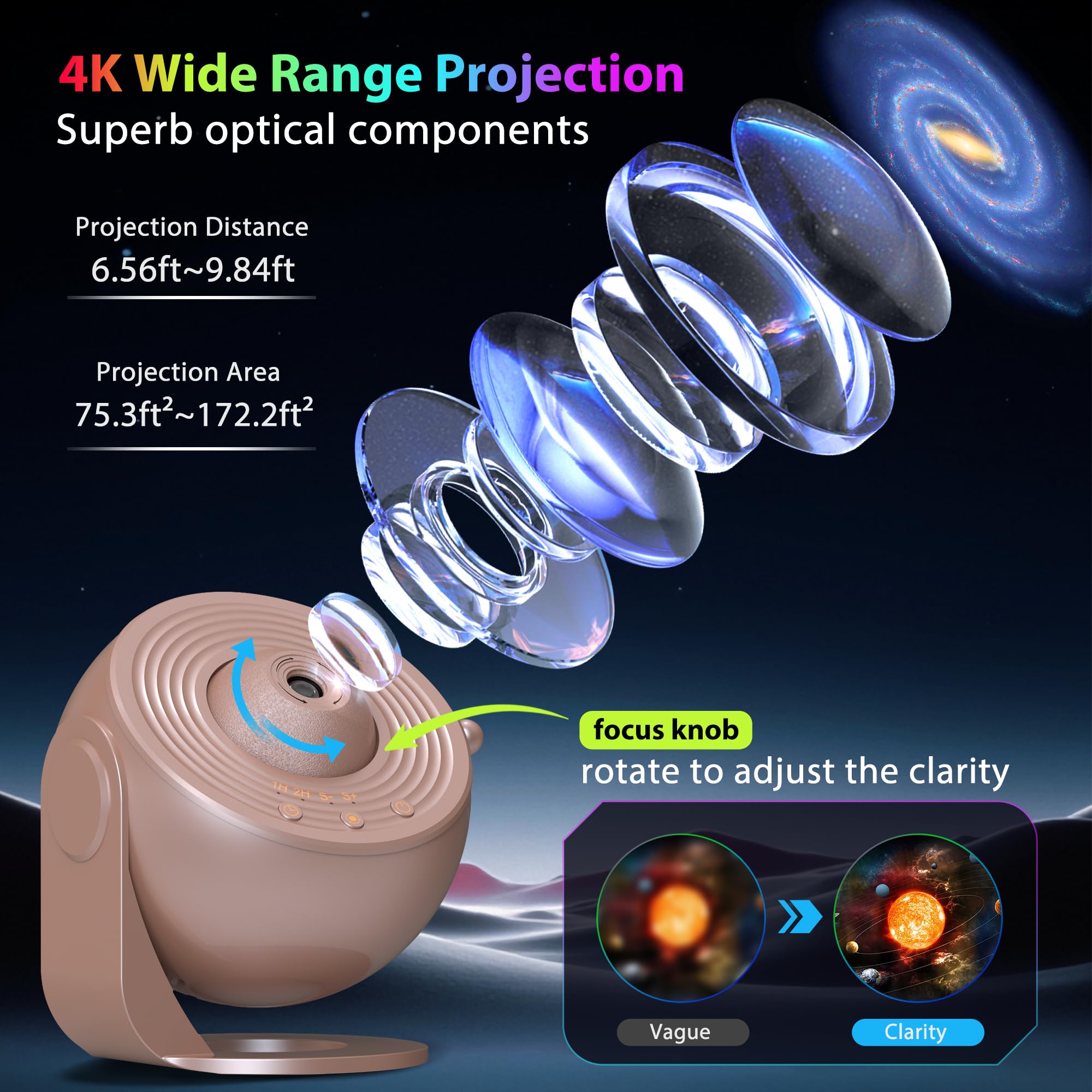 【Adjust the Knob to Get HD Projection】:This galaxy projector uses high-quality optical components to present vivid colors and projector large and bright star images. Please adjust the focus of the galaxy light projector by rotating the focusing head for clear and realistic imaging. ( The ultimate effect depends on the ceiling area, room lighting brightness, and the projection length and angle)