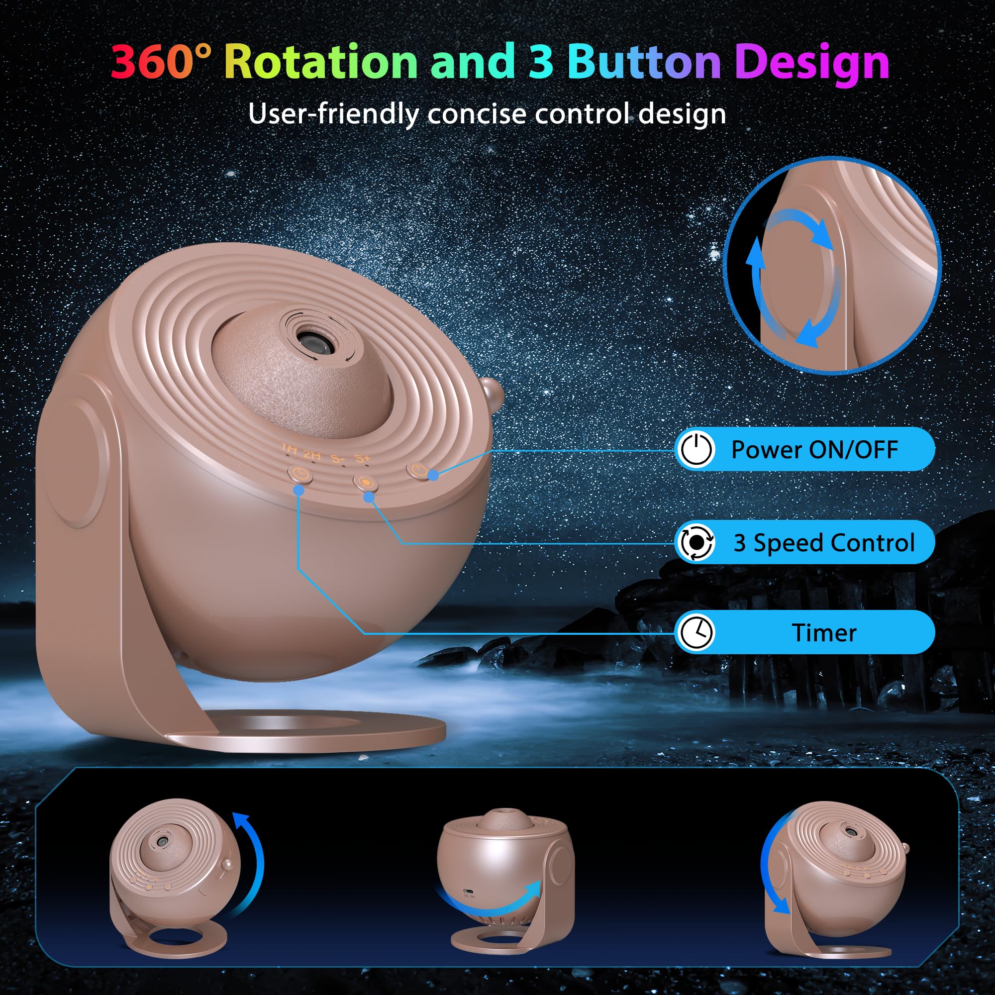 【Timer Function & Simple 3-Button Control】: This star projectors boasts for its easy-to-use 3 button design. The first button is the timer button 1h/2h (4h by default). In the middle is the projection rotation button (2 rotation speeds available), The last is the power button.