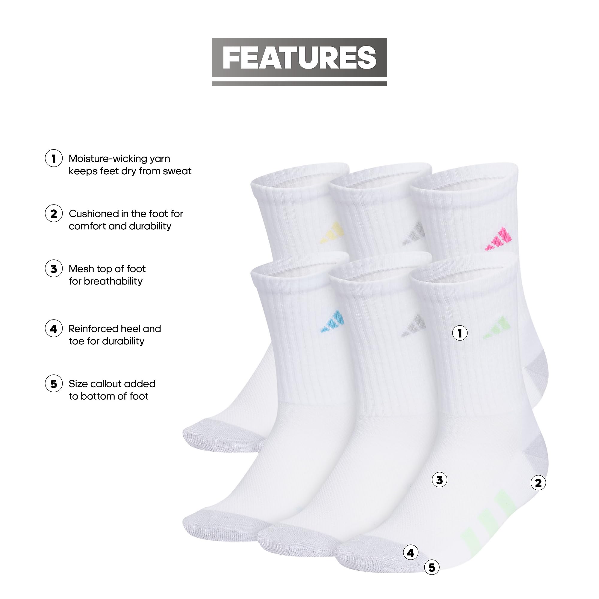 Description Enjoy comfort with adidas Athletic Cushioned Crew Socks. Well designed for kids socks, these socks are crafted to provide durability and breathability, making them an ideal choice for active youngsters. Available in versatile shades like black and white, these socks suit all preferences. Our socks for boys and girls come in various sizes, with a snug fit that supports daily activities. The reinforced heel and toe further support durability, making these socks perfect for everything from sports to daily wear. The cushioned footbed delivers comfort, while the mesh top allows for excellent ventilation to keep feet fresh. Choose adidas for quality girl socks that deliver on function and style.