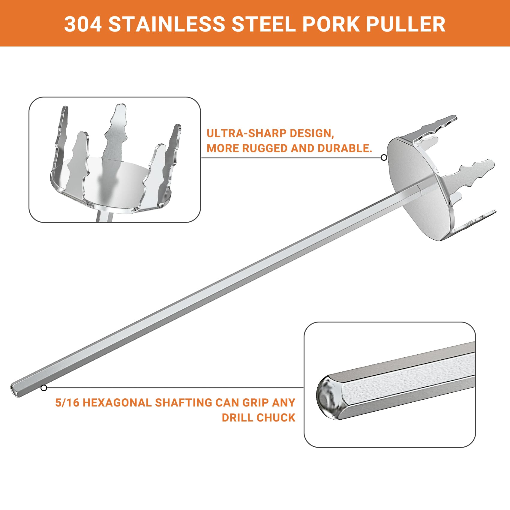 The pork puller shaft features hexagon design to grip drill chuck