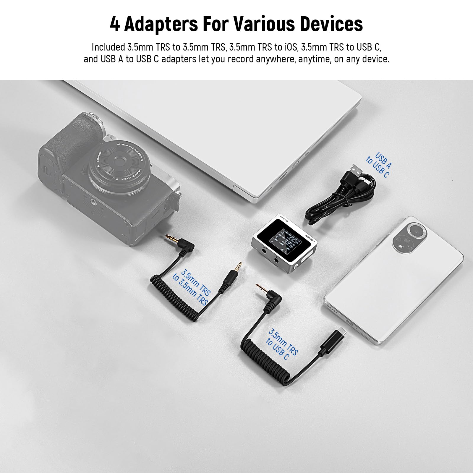 【Plug & Play for Three Devices】 This tiny external microphone kit requires no app. With two OTG adapters, a 3.5mm TRS audio cable, the little RX (receiver) connects up to 3 devices at the same time, compatible with iPhone USB Type C 16 Pro Max 15 14 13 Mini iPad Mac Samsung, USBC Android cell phone, tablet, laptop, computer, DSLR camera, and camcorder equipment. Small mic accessories for interview, professional video recording, podcast recording, content vlogging, Zoom, filming, etc.
