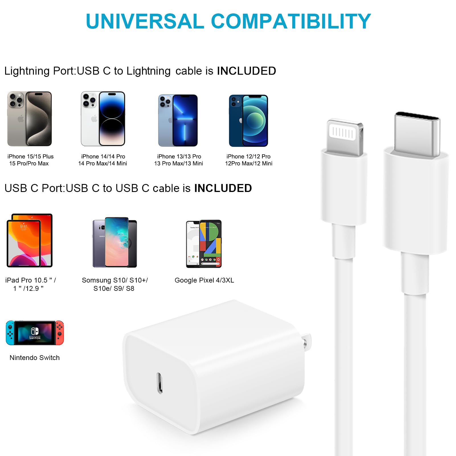 【Broad Compatibility 】Use the official USB-C lightning cable 20W USB C wall charger to access fast-charging iPhone 16/16 Plus/16 Pro/16 Pro Max/iPhone 15/15 Plus/15 Pro/15 Pro Max/iPhone 14/14 Pro Max/ iPhone 13/13 Mini/13 Pro/12/12Pro/12 Pro Max/12 Mini/11/11 Pro/11 Pro Max/XS Max/XS/X/XR/8 Plus/8 , iPad Pro/ iPad Air/ iPad, AirPods Pro/2021/2020/2018 iPad Pro 12.9/11 inch,iPad Air 4, Mac Book Air 13 inch, Mac Book 12 inch, Gen 4/3, iPad Pro 11 Gen 2/1, iPad Air 4, Google Pixel 4/ 4 XL / 3a XL / 3 / XL / 2, Samsung Galaxy S8 S9 S10 S20 Plus, Note 10, LG and more.