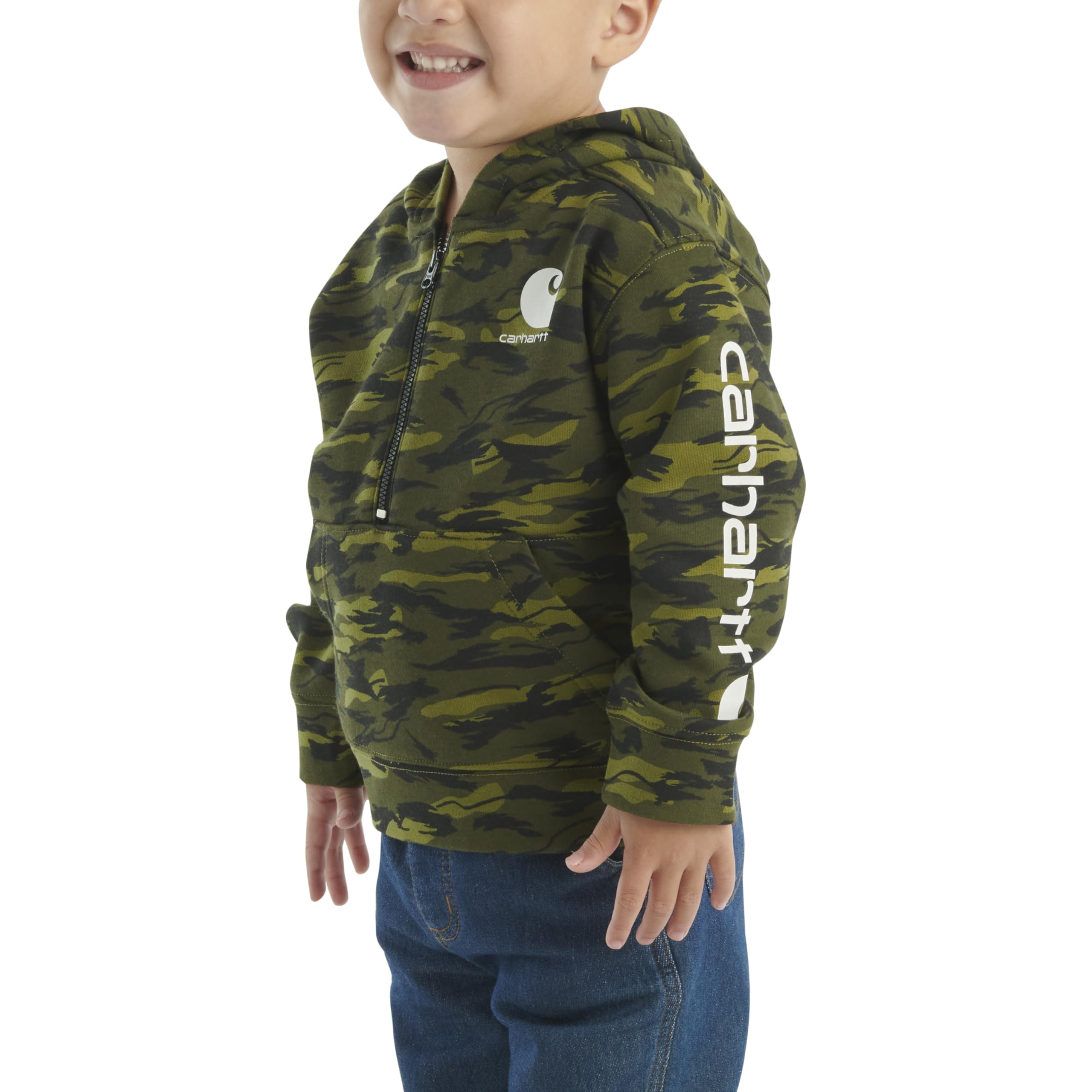 Description Made for the little guy with big energy, the Carhartt Baby & Toddler Half-Zip Hooded Sweatshirt keeps him warm, comfy, and looking cool wherever the day takes him. Whether he’s learning to walk, running with older siblings, or just napping in the stroller, this zip hoodie is built for comfort and durability. Constructed from heavyweight 9-ounce fleece (80% cotton, 20% polyester), it provides cozy insulation without being too bulky. The half-zip closure makes it easy to slip on over tees or bodysuits, and the roomy kangaroo pocket gives little hands a warm place to rest—or stash a favorite toy. Ribbed cuffs and hem help keep the cold out and the fit snug. With bold Carhartt branding on the chest and sleeve, this pullover zip hoodie brings workwear-inspired style to toddler wear. Whether it’s for daycare, preschool, family photos, or playdates at the park, this fleece sweatshirt is a reliable, machine-washable favorite for busy parents and growing boys.