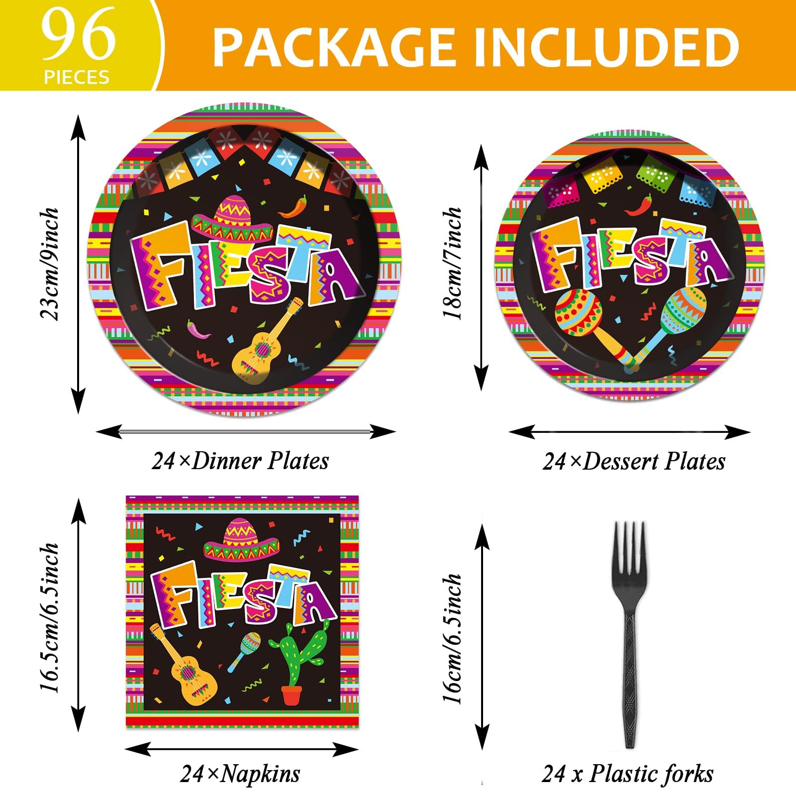 Super Value Pack:You will get 24 pieces Mexican theme party paper plates of 9"(22.5cm), 24 pieces Mexican theme party paper plates of 7"(17cm),24 pieces 2Ply Mexican theme party napkins of 4.9"(12.5cm),24 plastic forks of 6.5"(16.5cm) for enough dining for 24 guests.