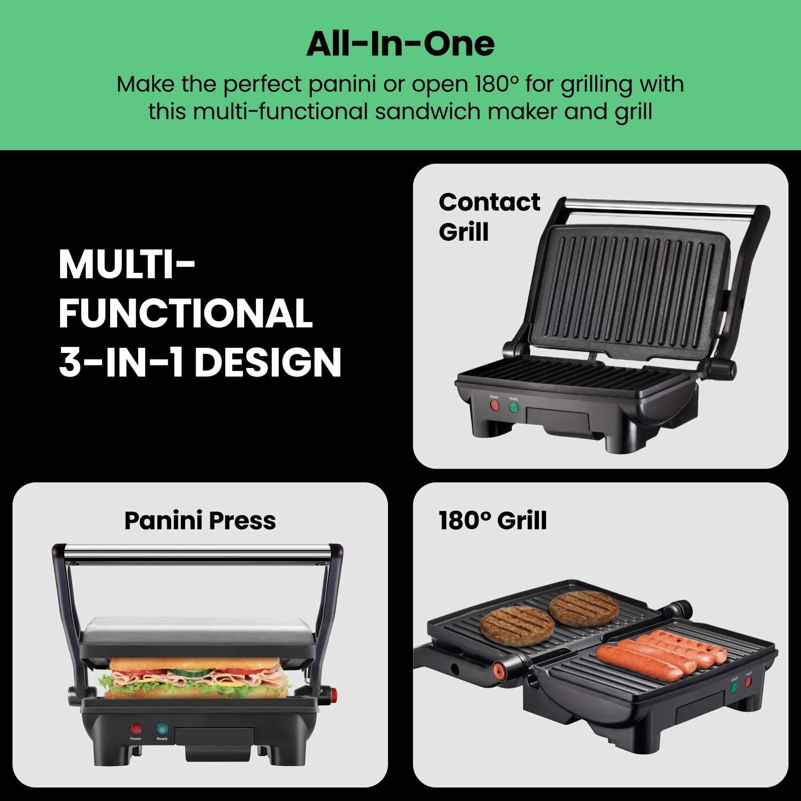HUNGRY FOR A SANDWICH? With just the push of a button, this Grill-Panini Press Combo can be used to press your custom sandwich or open at 180 degrees for grilling burgers, steaks, veggies and anything else you’re craving quickly and easily! Use it as a panini press for perfectly crisped bread- no cooking spray required.