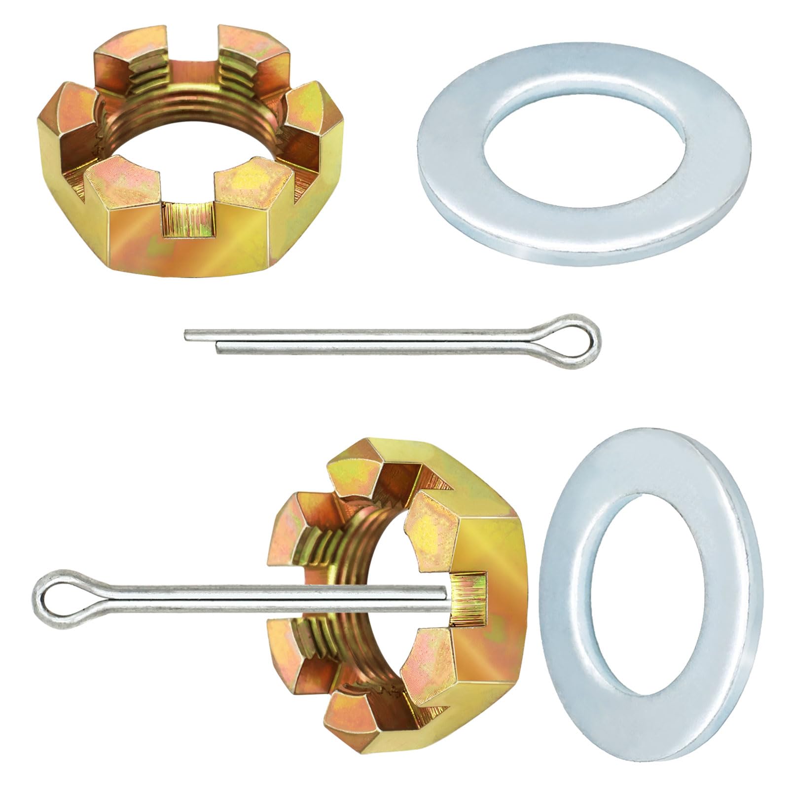 Package includes: 2 x spindle nuts (ID: 1 inches; OD: 1.45 inches), 2 x cotter pins (2.25 inches long) and 2 x washers (ID: 1 inches).