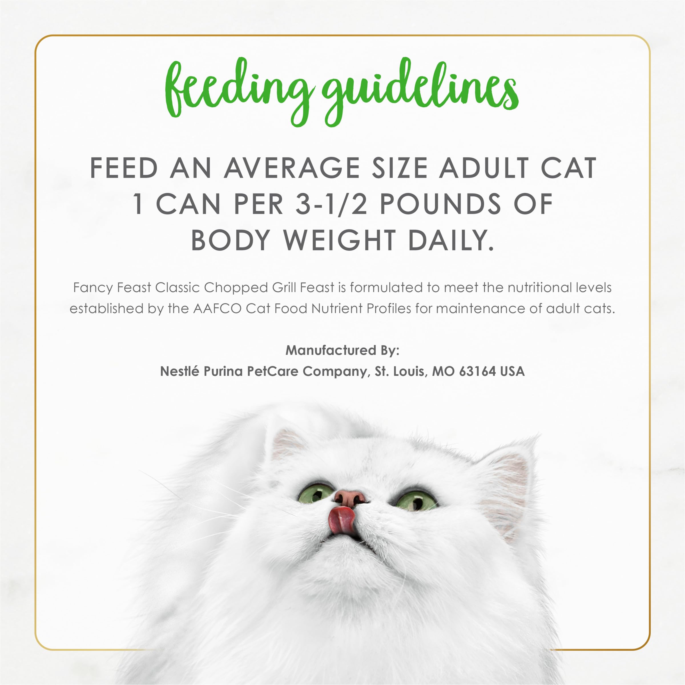 Offer up classic flavor when you serve Purina Fancy Feast Classic Chopped Grill Feast adult wet cat food at mealtime. Savory poultry gives this gourmet wet cat food the grilled chicken taste cats crave, and the high-quality ingredients add to the exceptional level of taste found in every serving. A delightfully smooth texture keeps her interested during feedings. Show her that her health and wellness are important to you by giving her a food made with essential vitamins and nutrients, and rest easy knowing that this canned cat food offers complete and balanced nutrition for adult cats to help her maintain her active lifestyle. Follow the serving directions to provide a perfectly portioned meal to satisfy her cravings for delicious goodness, and explore our other Purina Fancy Feast Classic recipes to add a little variety to your beloved feline's diet. With just a few clicks on Amazon.com, you can give your feline the nutrition she needs with an order for Purina Fancy Feast wet cat food.