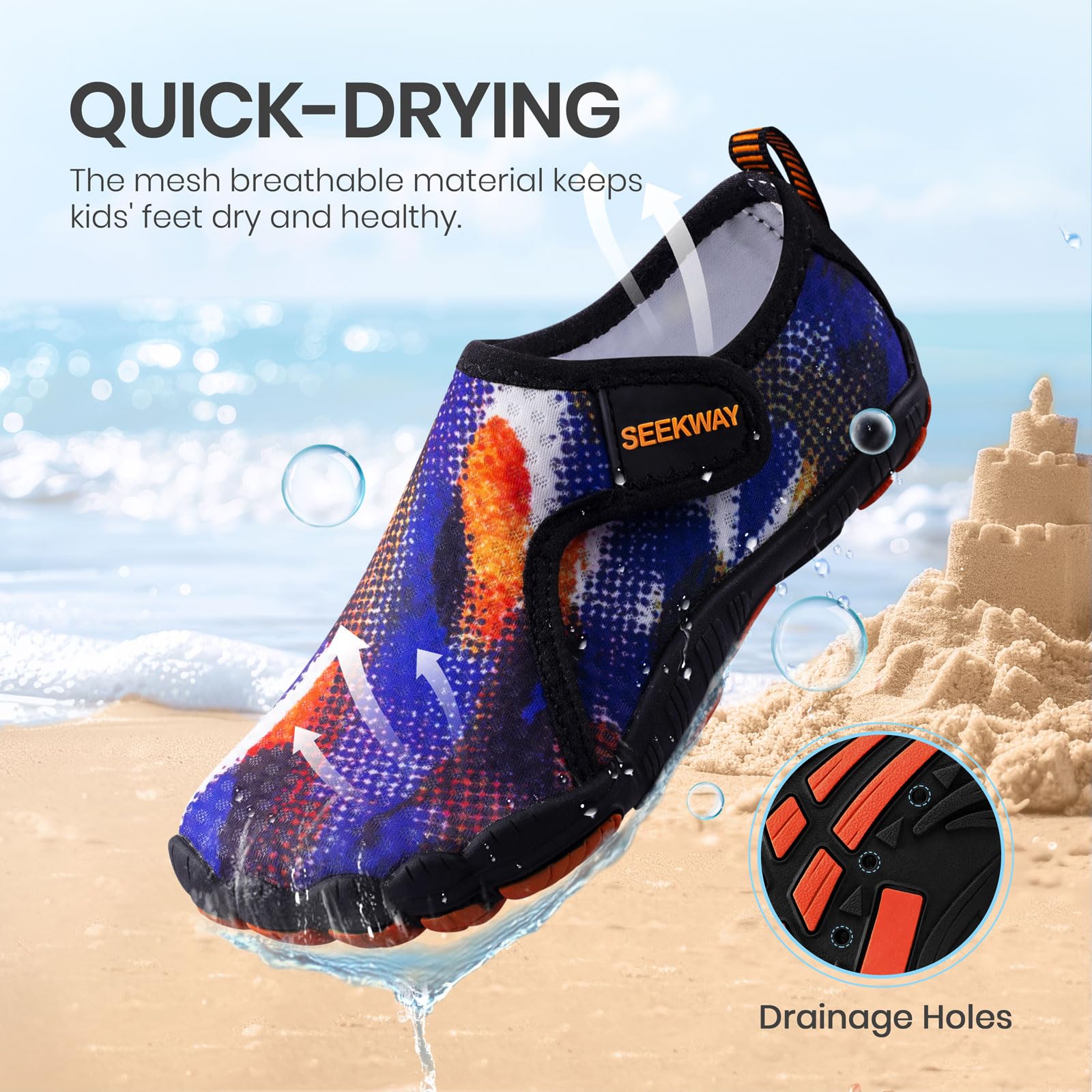 【Breathable & Permeable Material】: The mesh breathable material on the upper combined with drainage holes on the outsole keeps kids' feet dry and healthy.