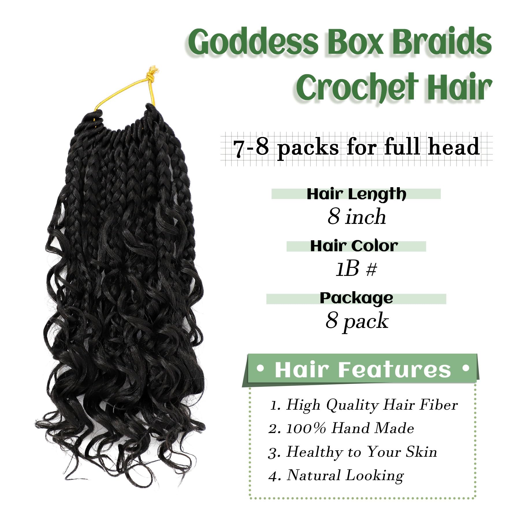 Hair Length and Package: goddess box braids crochet hair is 8 inch, 10 inch, 12 inch and 14 inch,16inch, 18 inch and 24 inch, 8-9 packs are enough to make a full head. Hair Color:1B, #2 , #27 , #30 , 1B /27 color, 1B/30, T30/27,T30/613,Tgray color, 1B/Burgundy and T1B/blue color. More colors are available.