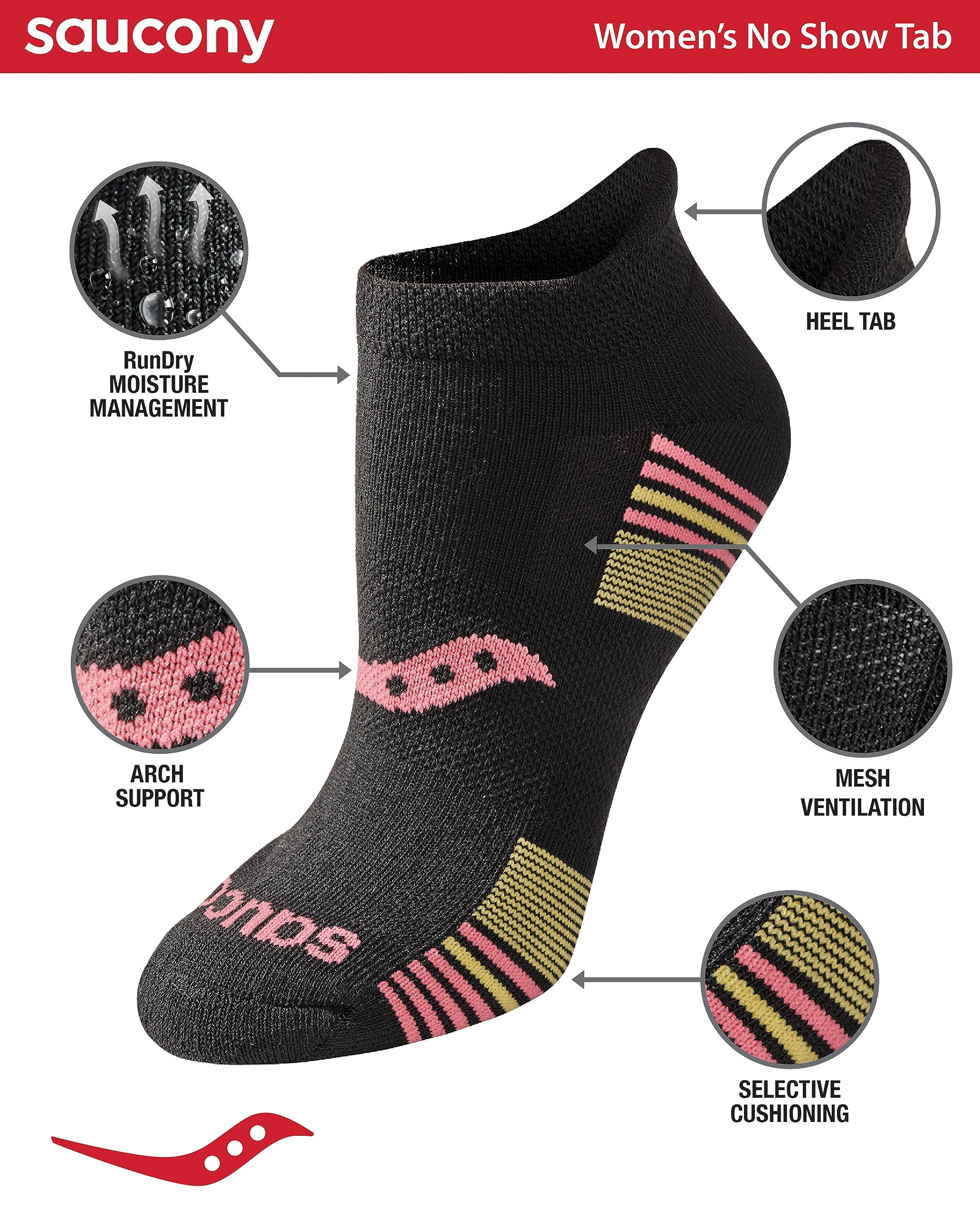 Description Saucony Women's Performance Heel Tab Athletic socks are a perfect combination of comfort and support. Great for the toughest training sessions. Features include heel tab design for added protection and comfort, RunDry moisture management to keep feet dry, arch support for an improved and secure fit, Mesh ventilation that enhances breathability and comfort, targeted zone cushioning in high impact areas for added comfort, and comfort toe seam for reduced irration.