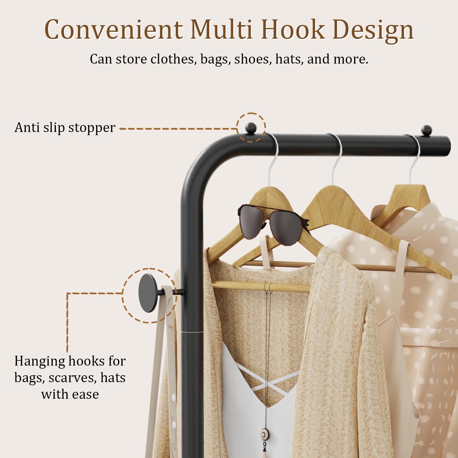 Versatility: Not only can clothes be stored on the suspension beam of the hanger, but it also uses a rock base to store shoes and other items. In addition, the hook on one side can also hold accessories such as bags and umbrellas