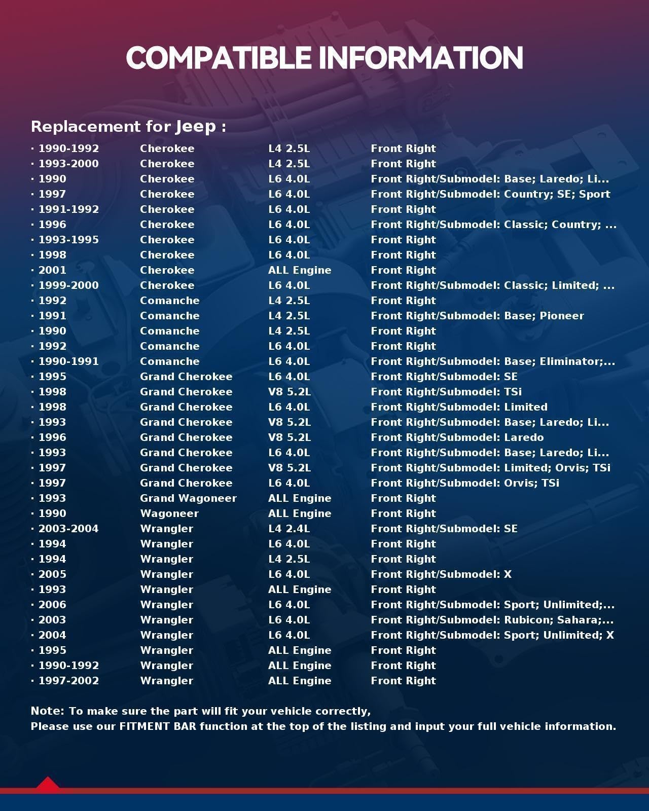 [Vehicle Fitment]: Compatible with Jeep Cherokee 1990-1992(4WD) 1993-2001, Comanche 1990-1992(4WD), Grand Cherokee 1993-1998, TJ 1997-2006, Grand Wagoneer 1993, Wagoneer 1990, Wrangler 1990-2006 -- Front Right, Passenger Side.