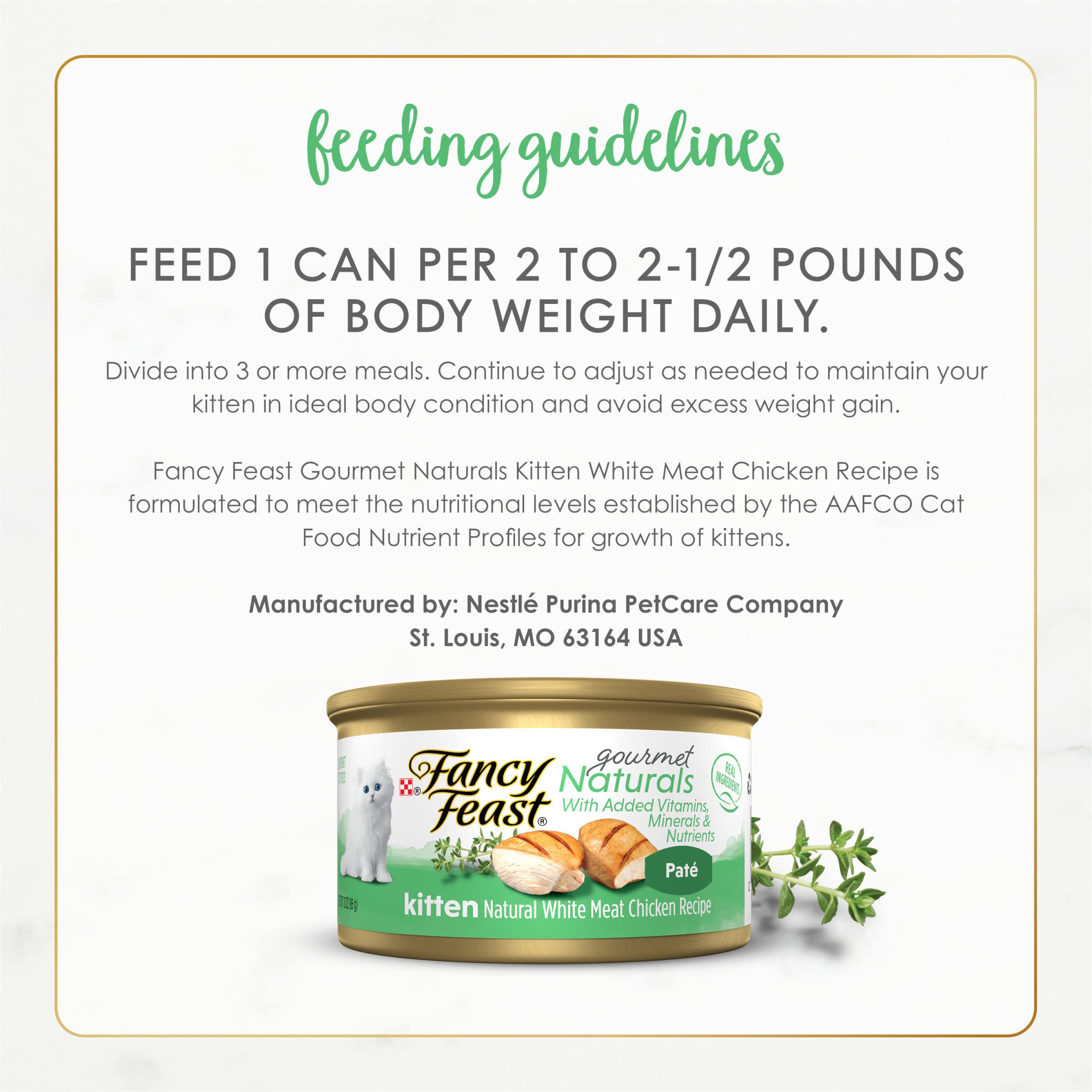 Introduce your new kitten to the exceptional taste Fancy Feast is known for early in life by serving Purina Fancy Feast Gourmet Naturals White Meat Chicken Kitten Recipe With Added Vitamins, Minerals and Nutrients wet kitten food. Made with real white meat chicken, our Fancy Feast kitten pate has a delightfully smooth, finely ground texture perfect for your little connoisseur’s teeth to manage. Our natural kitten food with added vitamins, minerals and nutrients gives your kitten the 100 percent complete and balanced nutrition she needs to thrive. To meet your ingredient expectations for her, we craft this grain free wet cat food with high-quality ingredients and without artificial flavors, colors or preservatives. The convenient multi-pack includes 12 easy-to-open cans of our gourmet kitten food to help keep your pantry stocked. Show your newest family member how much you already love her when you feed her Purina Fancy Feast Gourmet Naturals White Meat Chicken wet kitten food at mealtime.