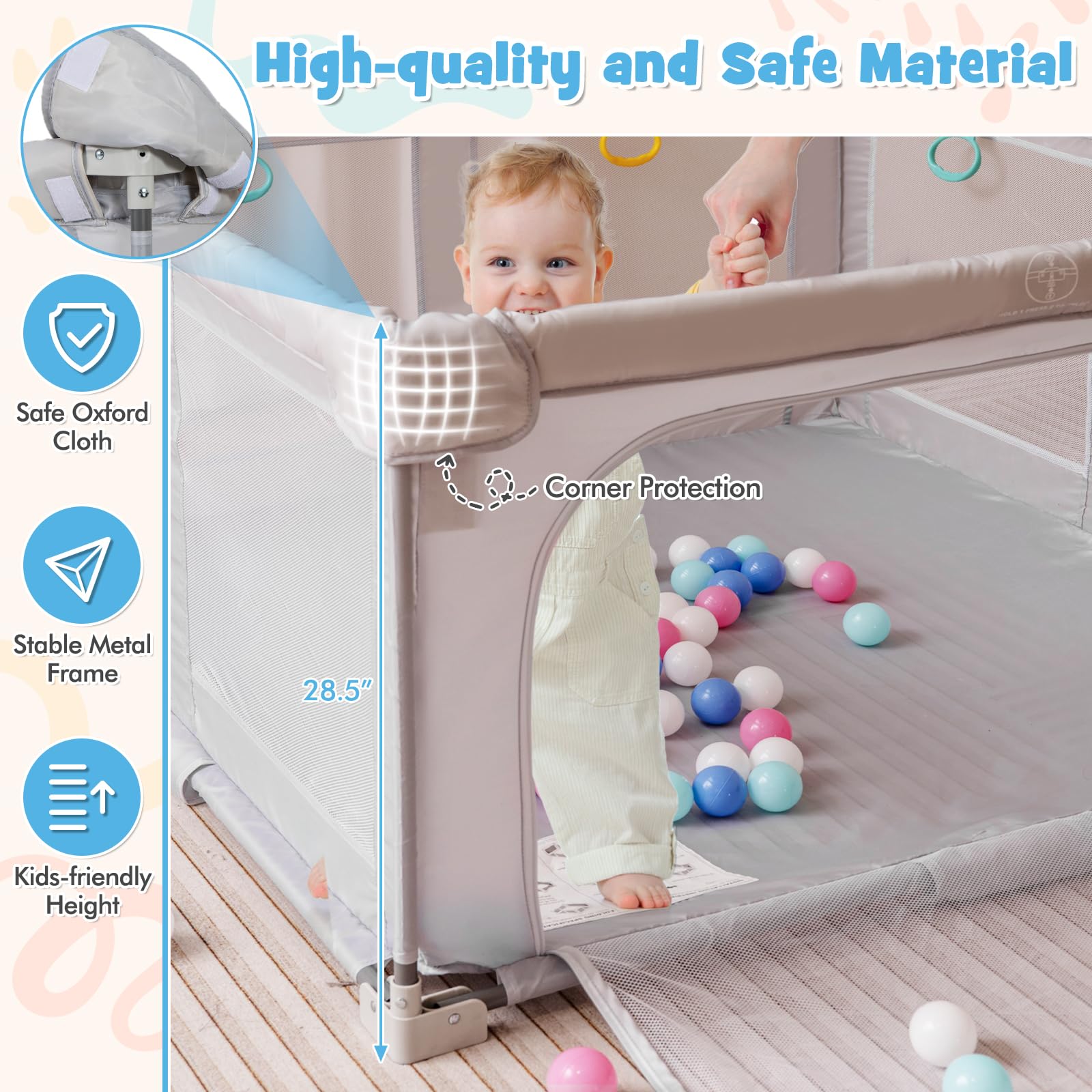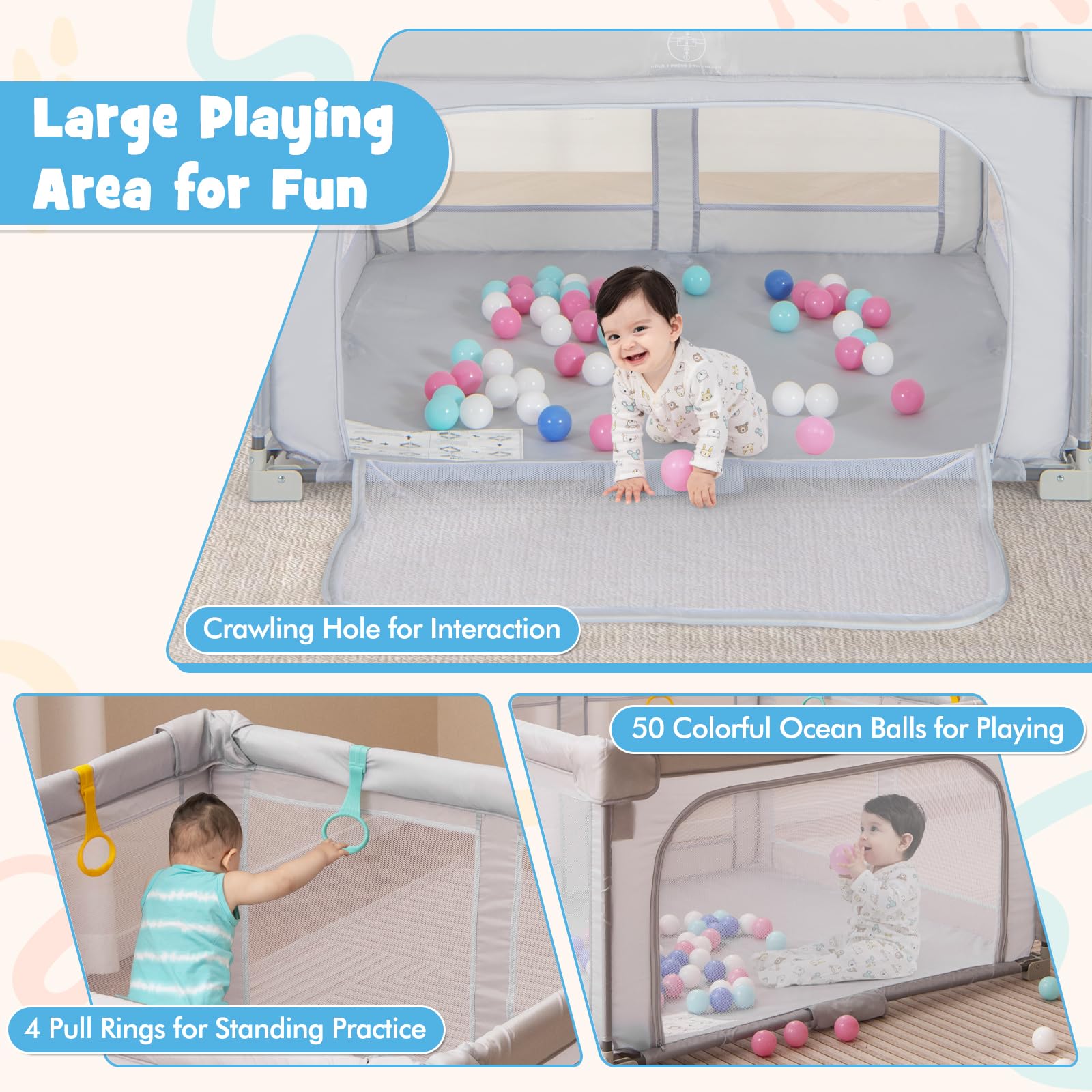 LARGE PLAYING AREA FOR FUN: Transform any play area into a safe and fun space with our playpen! Featuring 4 pull rings for standing practice, 50 colorful ocean balls for playing, and a crawling hole for interaction. The proper scientific height is enough for the baby to stand and walk while having room inside to explore the surroundings. Get the best playpen for your child to enjoy hours of fun and playtime!