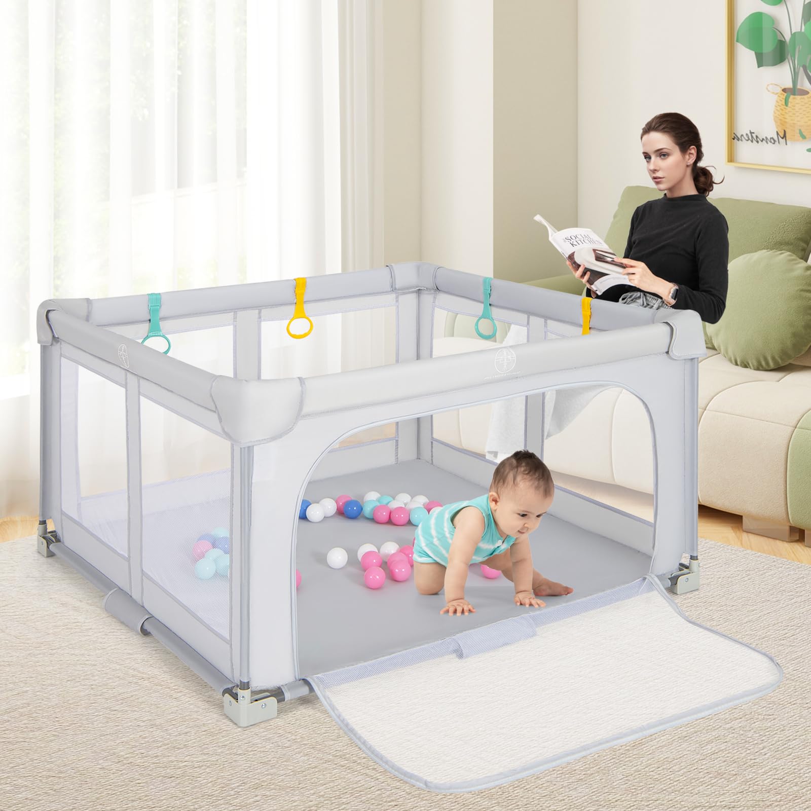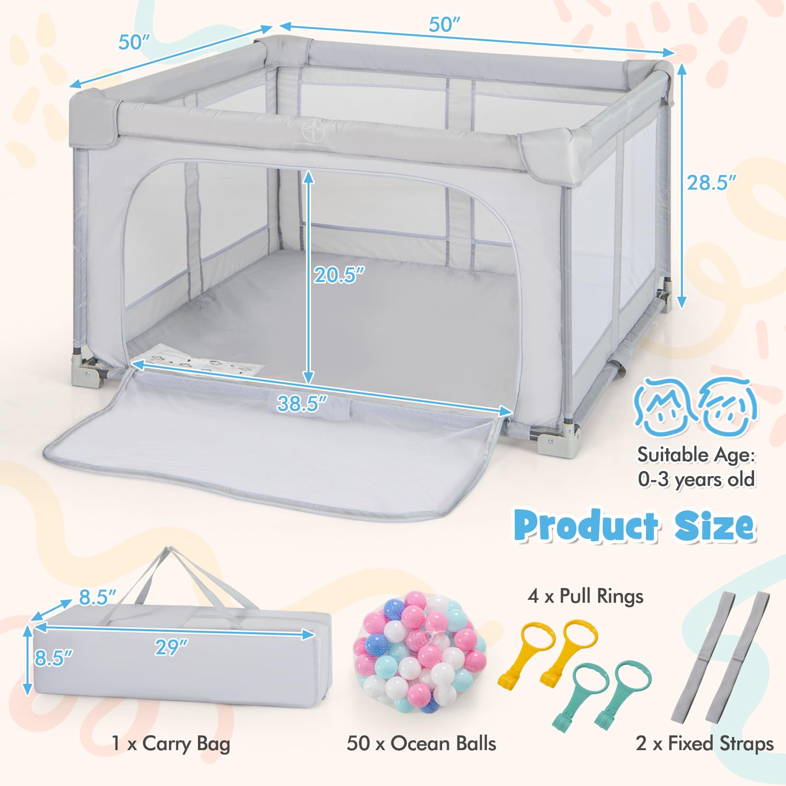 Description: Our spacious baby playpen is designed for children up to 3 years old. With dimensions of 50" x 50"/59" x 59", this playpen offers a considerable area for your baby to safely crawl, walk, stand, and enjoy playtime. For added convenience and fun, the playpen includes a zip-open side door for easy access, 50 colorful ocean balls, and 4 pull-up rings that help in developing your child's physical activity and motor skills. 360° see-through mesh cloth not only enhances durability but also allows for continuous interaction and visual contact. Moreover, the playpen is foldable and comes with a carry bag, making it easy to set up, fold down, and transport. When you need some free time to cook, prep, or have some alone time, you may need a secure playpen for your baby to free your hands. Our premium baby playpen is definitely a great option! Features: Safe, soft and elastic materials can give babies a comfortable touch Large playing space for baby to play, crawl and walk Breathable mesh design provides good visibility and ensures safety Height of the panel is suitable for the baby to learn to walk External double-zippers prevent the baby accidentally exiting 50 colored balls are included for added entertainment Seamless fit and anti-collision foam pads at joints Easy setup with tool-free folding and unfolding Compliant with ASTM and CPSIA standards Specifications: Color: Grey Material: Oxford Fabric + Mesh Cloth + Metal Overall Dimension: 50" x 50" x 28.5"/127 cm x 127 cm x 72.5 cm (L x W x H) Side Door Dimension: 38.5" x 21.5"/98 cm x 55 cm (L x H) Suitable Age: 0-3 years old Net Weight: 13.5 lbs/6 kg Package Include: 1 x Baby Playpen 50 x Ocean Balls 4 x Pull-up Rings 1 x Carry Bag 1 x User Guide