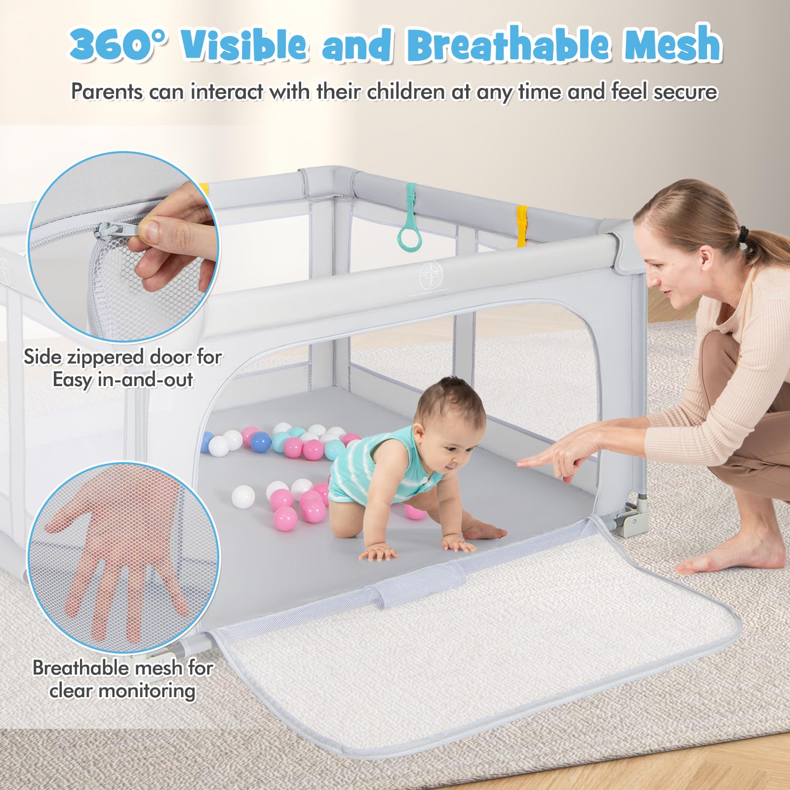 360° VISIBLE FOR PROTECTION: Keep a watchful eye on your child from any angle with the 360° visible baby playpen. Foster bonding through fun interactions while ensuring your baby's safety. Imagine your little explorer in a magical world surrounded by ventilated mesh walls, playing peek-a-boo with you from all directions – our spacious playpen creates a paradise for your child to enjoy! Outfitted with breathable mesh for clear monitoring and side zipper doors that prevent climbing out.