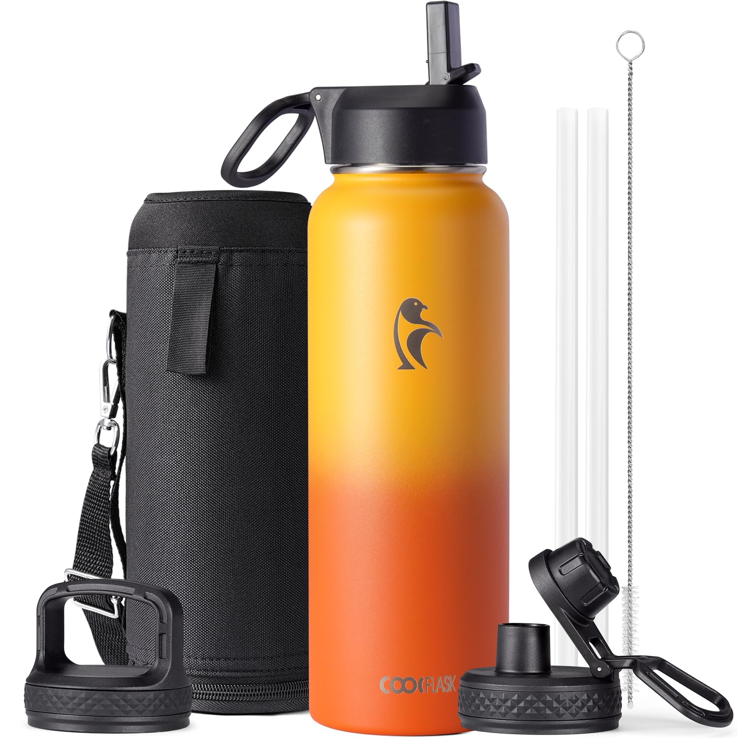 Flexible Drinking On-the-Go: This 40 oz water bottle comes with 3 different lids. The screw-on lid with flip-up handle is for easy ice refilling with superior portability; spout lid makes it convenient to drink hot liquid and straw lid for sipping cold.