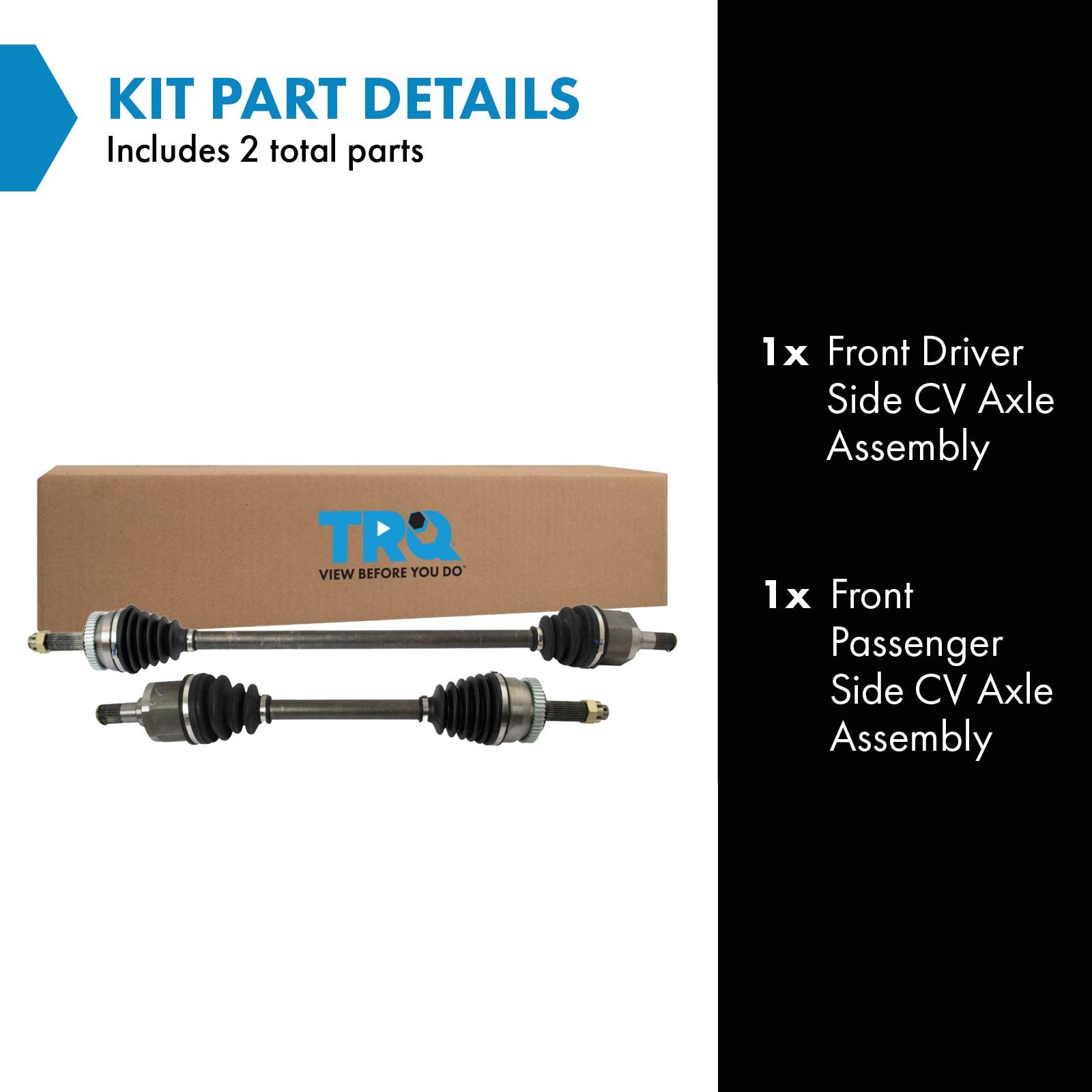 2 Piece CV Axle Assembly Set Kit Includes (1) Front Driver Side CV Axle Assembly (1) Front Passenger Side CV Axle Assembly Fitment Compatible with: 2005-09 Kia Sportage L4 2.0L Front Wheel Drive Front Driver & Passenger Side Compatible with: 2005-06 Hyundai Tucson GL Front Wheel Drive Automatic Transmission Front Driver & Passenger Side Compatible with: 2007 Hyundai Tucson GLS Front Wheel Drive Automatic Transmission Front Driver & Passenger Side Compatible with: 2008-09 Hyundai Tucson L4 2.0L Front Wheel Drive Automatic Transmission Front Driver & Passenger Side Product Attributes Quantity: 2 Piece Product Features 100% New: Manufactured to tighter tolerances for extended service life Neoprene Boots: Improved durability compared to stock material Moly Greased: Specifically-designed grease shield to reduce premature wear Application Specific Design: No modification Item Details TRQ CV (constant velocity) drive axles are manufactured using premium raw materials designed to restore original performance. TRQ CV drive axles are new, so there is no core charge with your TRQ purchase. TRQ-designed drive axles utilize neoprene boots, moly grease, stainless steel clamps, and heat-treated ball tracks to ensure extended service life. Each TRQ axle is application-specific so each spline and thread will mate properly for a seamless fit. All products are fit and road-tested in our Massachusetts R&D facility to ensure we deliver on our promise of Trusted Reliable Quality. Reference Numbers 447-61610R 447-61611L 447-61612L 447-61613L 447-61689R 447-61693L 447-61694L 495001D200 495001D201 495001F200 495002E200 495002E500 495011D501 495011F200 495011F400 495012E201 495012E400 495012E900 66-3504 66-3505 HY-8371 HY8371 NCV37567 NCV37568 NCV51519