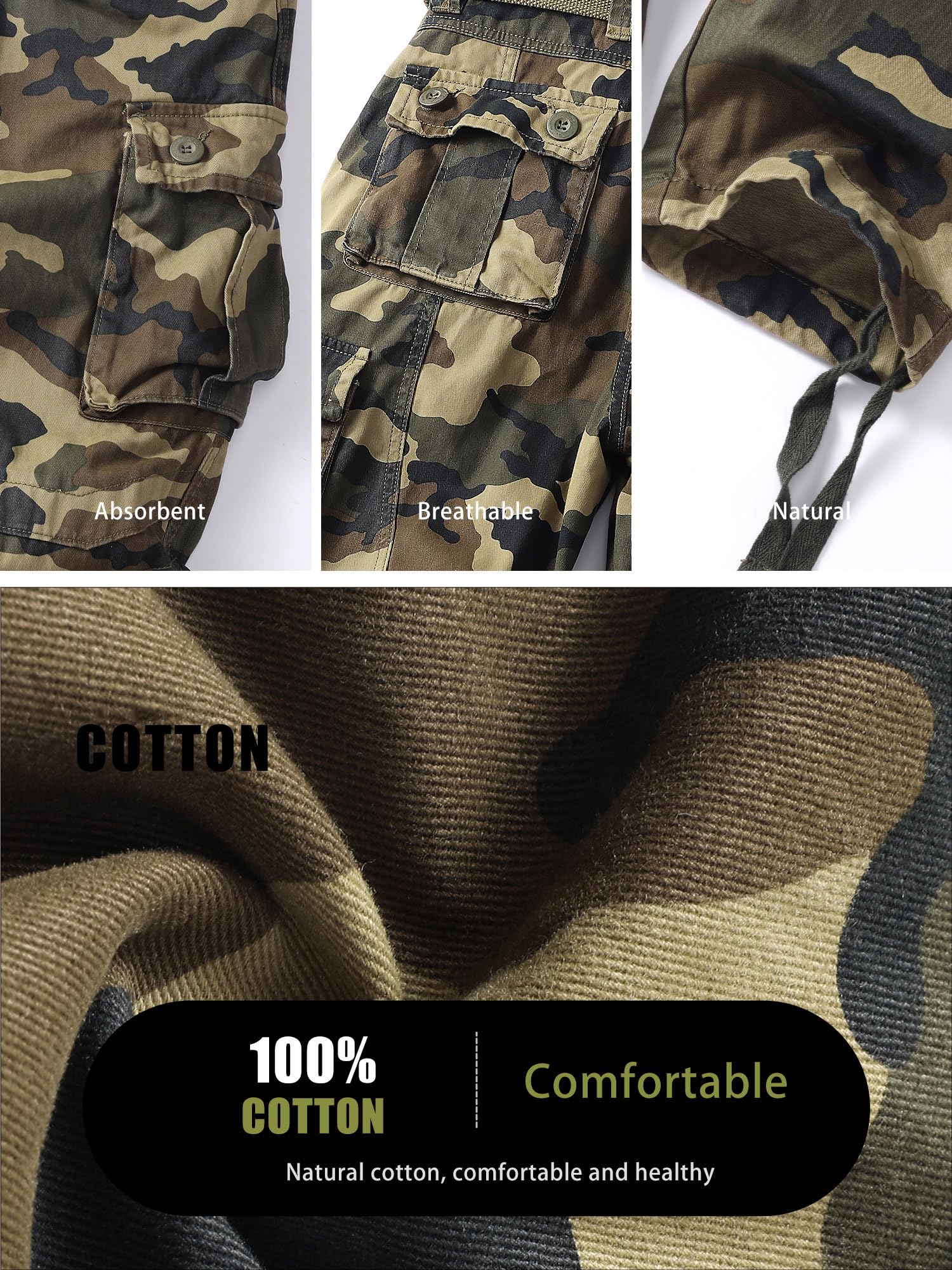 Product Design:Classic cargo pants with 8 pockets, all three-dimensional design with hand pockets x2,extra buttoned flap pockets x2 , side fast opened large pocket x2,rear pockets x2, makes it easier to carry additional personal things,Designed with a relaxed fit through the seat and thigh, these men's casual wear will keep you comfortable during any task.It is made of easy care wrinkle resistant fabrics, roomy pockets & sturdy zippers & buttons.