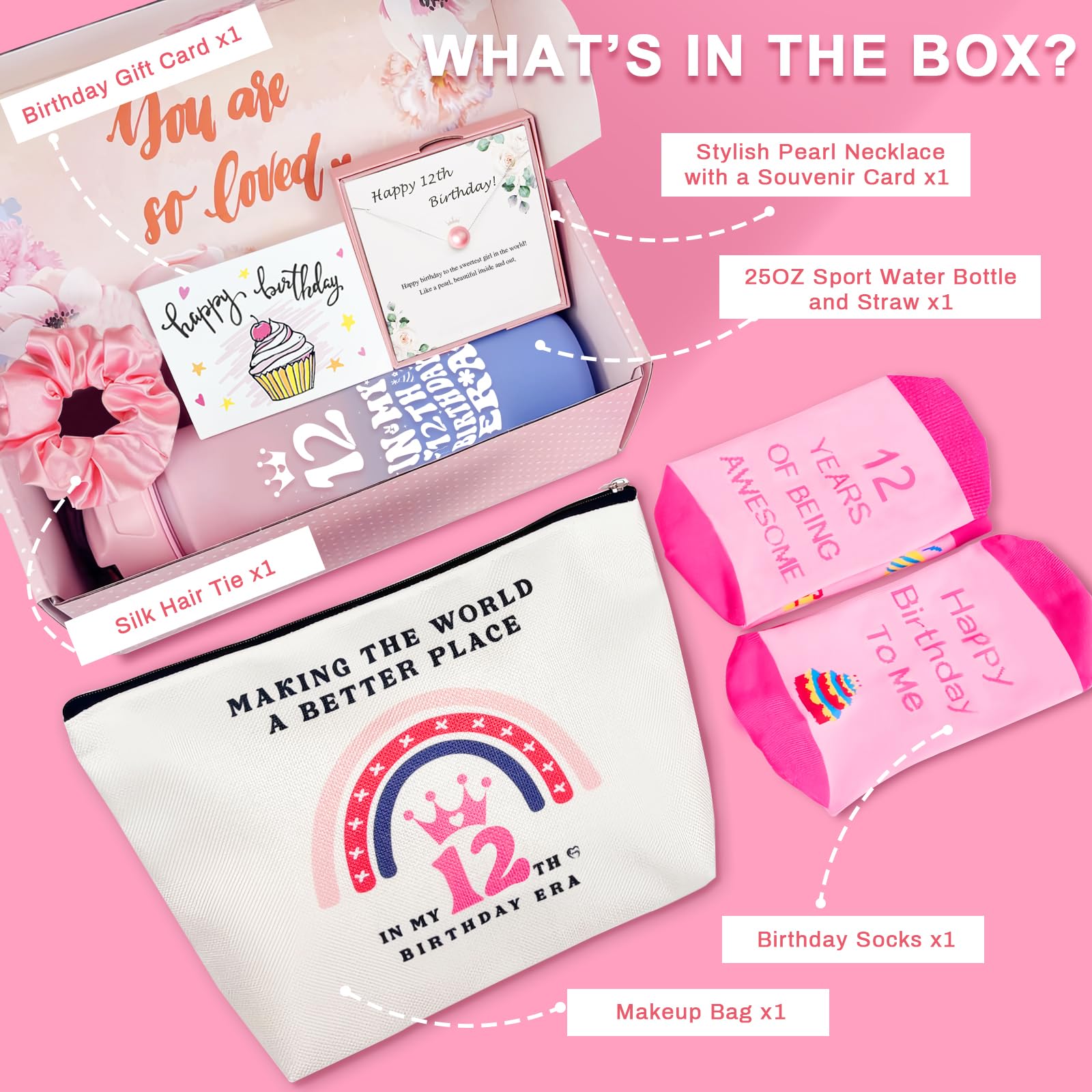 【7 Pieces Unique 12th Birthday Wishlist Gifts 】7 Beautifully packaged gifts 1 x 25 oz tumbler, 1 x stylish pearl necklace with a souvenir card, 1 x double-sided printed cosmetic bag, 1 x fancy birthday socks, 1 x hair tie, 1 x birthday card(Write your blessings), 1 x gift box. Receiving this gift box set, she will feel extremely happy and cherished, as if she has an exclusive luck and blessing