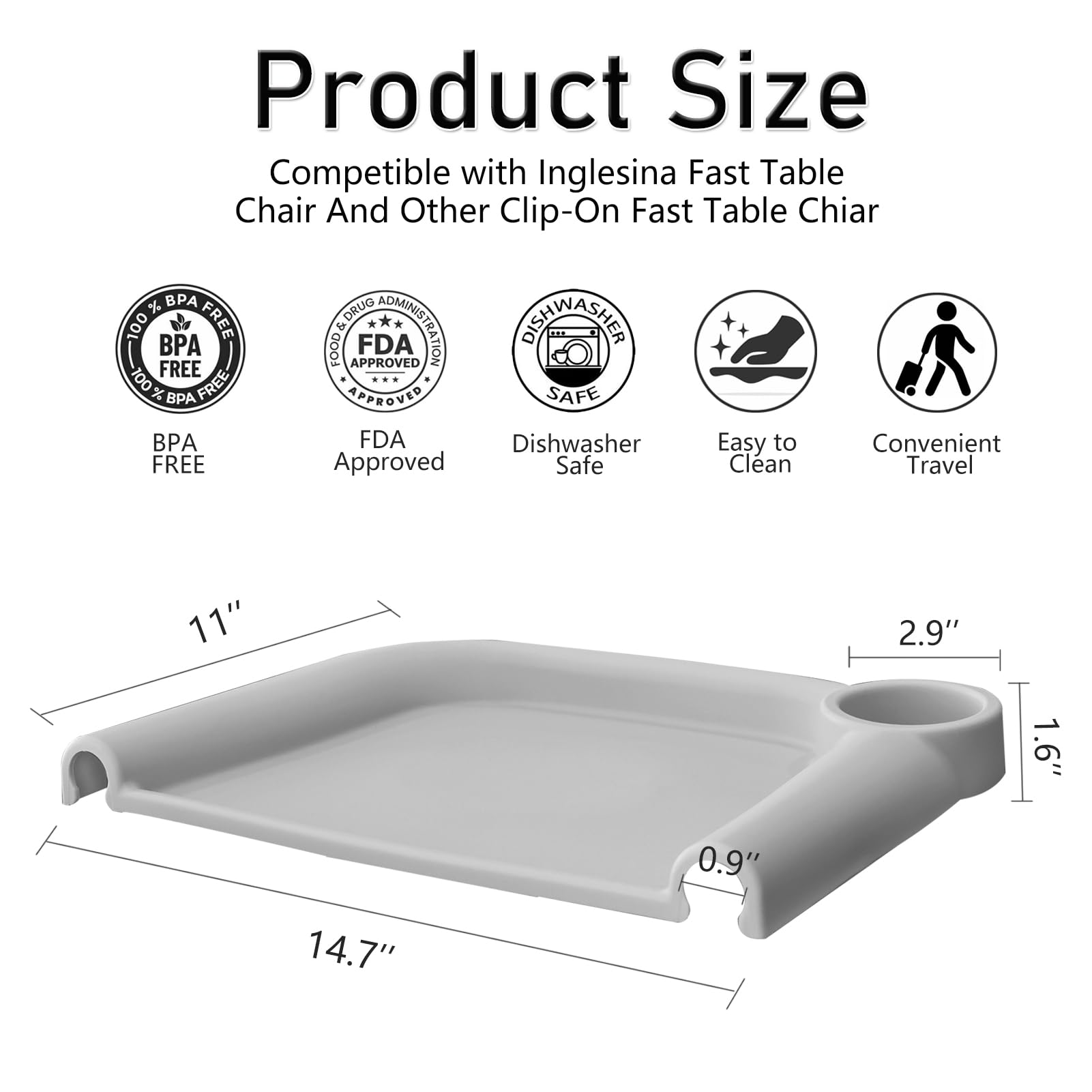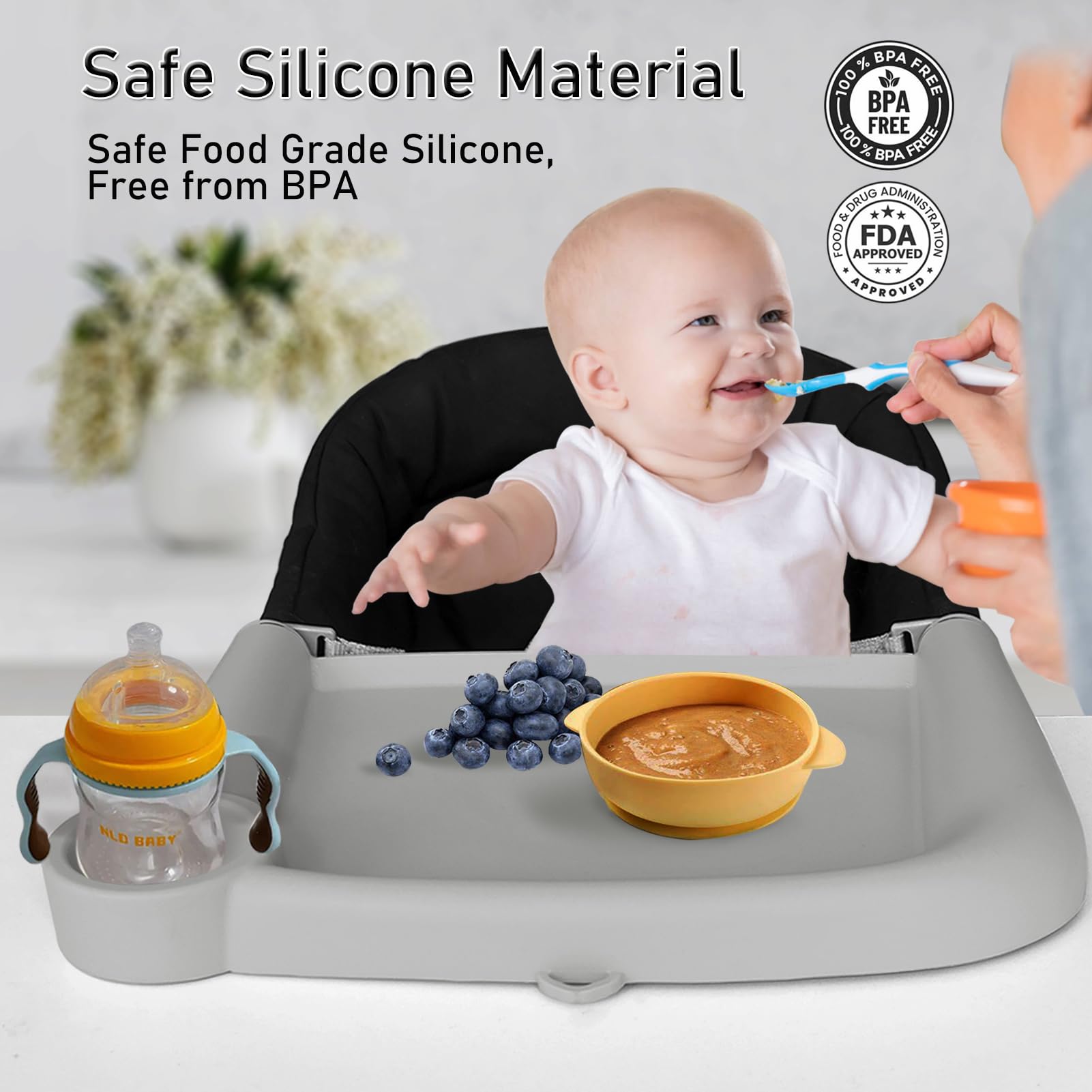 Our hook-on high table chair tray made of food grade silicone, BPA free and dishwasher washable, resistant to low and high temperatures up to -40°~240°.