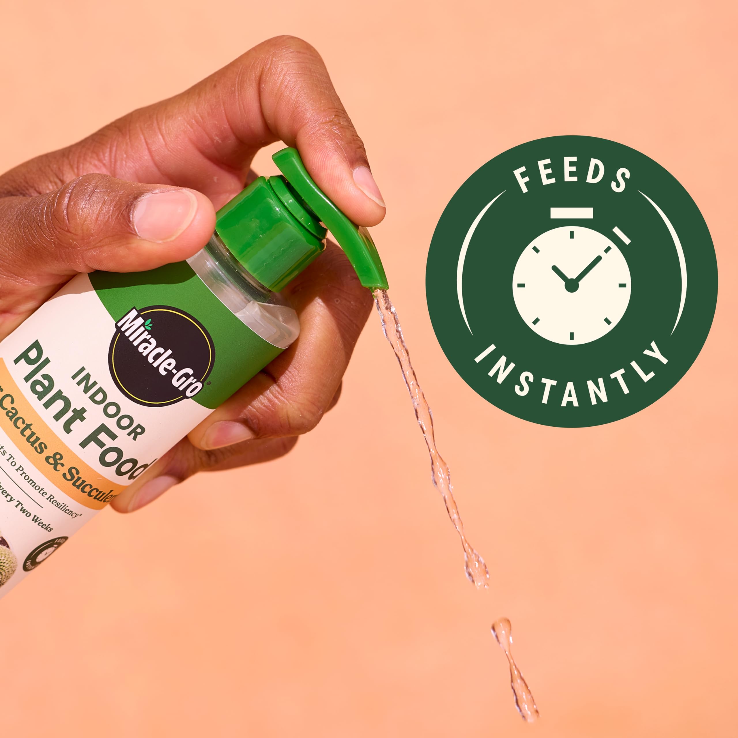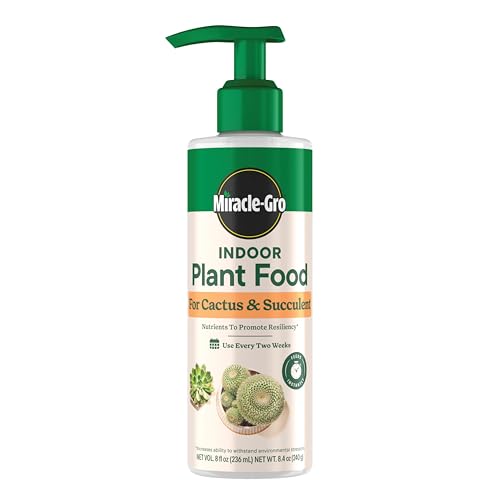 Grow a stunning indoor garden of succulent plants with Miracle-Gro Indoor Plant Food for Cactus & Succulent. Specially formulated with phosphorus and potassium, this liquid plant food provides your cactus and succulents with essential nutrients that promote resiliency (increases ability to withstand environmental stressors). With this succulent plant food, you can give a nutrition boost to all types of indoor succulents, including cactus, jade plants, prickly pear, aloe vera, kalanchoe, sedum, and more. Feed your succulents instantly with just 2 pumps of plant food for small pots or 4 pumps for larger pots (over 6 inches in diameter). Continue to water plants as usual. If you prefer, simplify your plant care routine by feeding and watering at the same time! Mix 8 pumps of plant food per 1 quart of water in a watering can, and water your plants as usual. For best results, reapply this plant food every two weeks. This bundle comes with two 8 fl. oz. bottles of Miracle-Gro Indoor Plant Food for Cactus & Succulent; for more spectacular results, use with Miracle-Gro Indoor Potting Mix for Cactus & Succulent, sold separately.