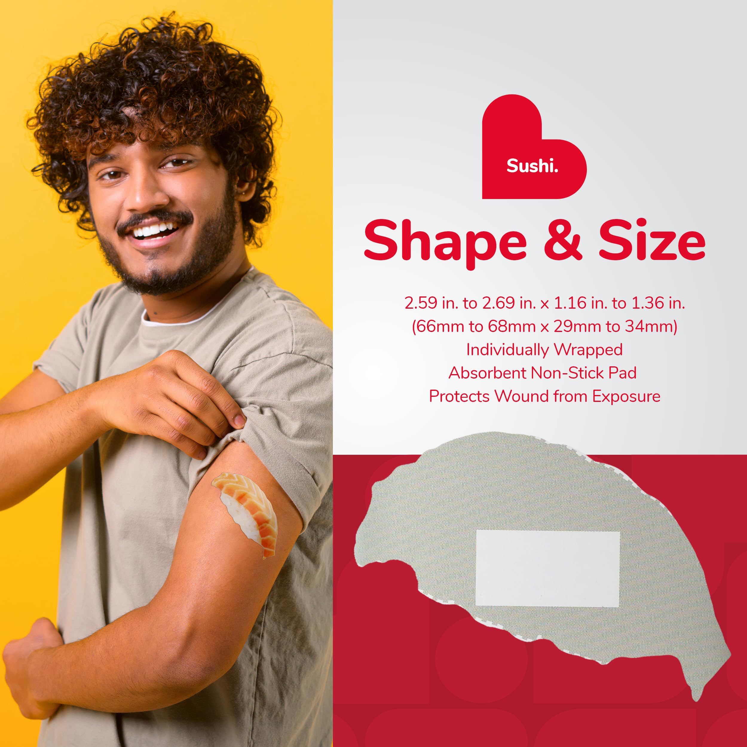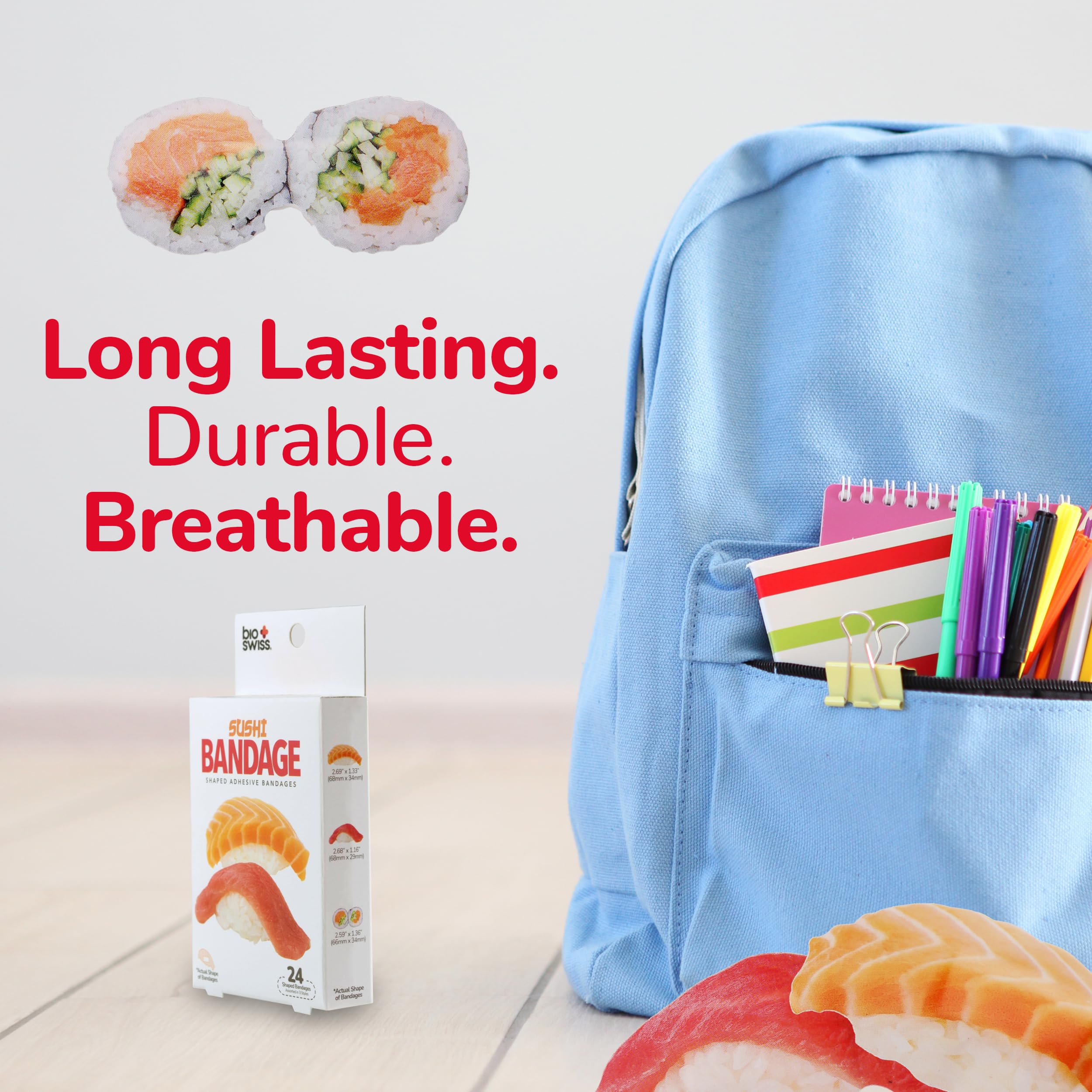 24 SUSHI KIDS BANDAGES: Fun sushi-shaped adhesive bandages pack helps protect cuts, scrapes, and minor wounds while making healing less stressful for children; bandages come in 3 assorted styles