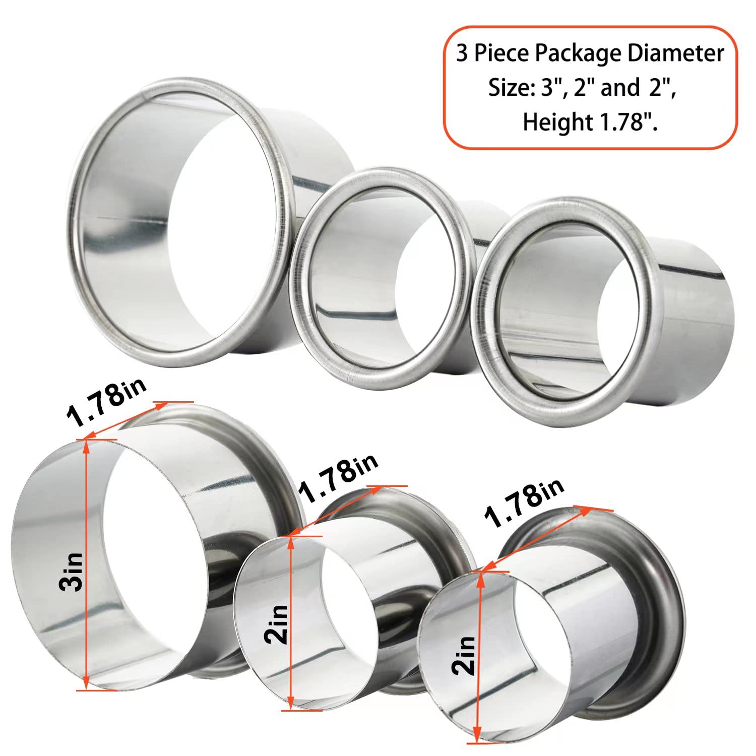 3 pieces package diameter Large inner diameter: 3inch, Medium inner diameter: 2inch 2pcs and Height: 1.78inch.