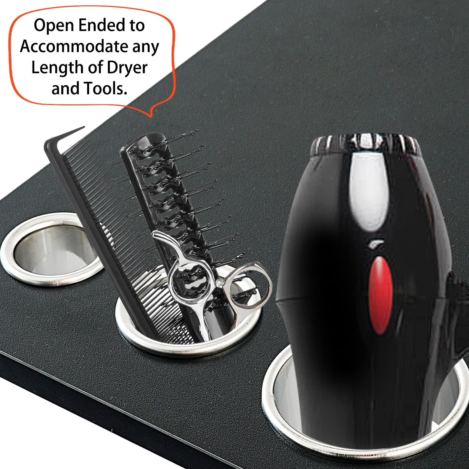 Open ended to accommodate any length of hair dryer curling flat and hot iron tools, round overhand lip to insert into cutouts so they do not drop down.