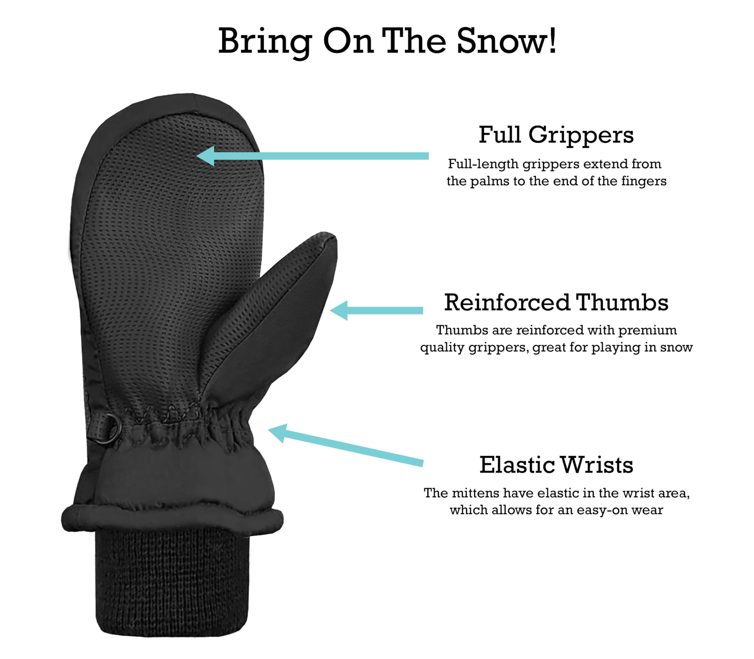 BRING ON THE SNOW! Your little girls, boys, toddlers and infants will love playing in the snow wearing these warm and high quality kids insulated winter mittens. The childrenβs winter gloves have a grippy palm area as well as grippers on the thumbs, which makes them well suited for playing in the snow and other cold weather activities.