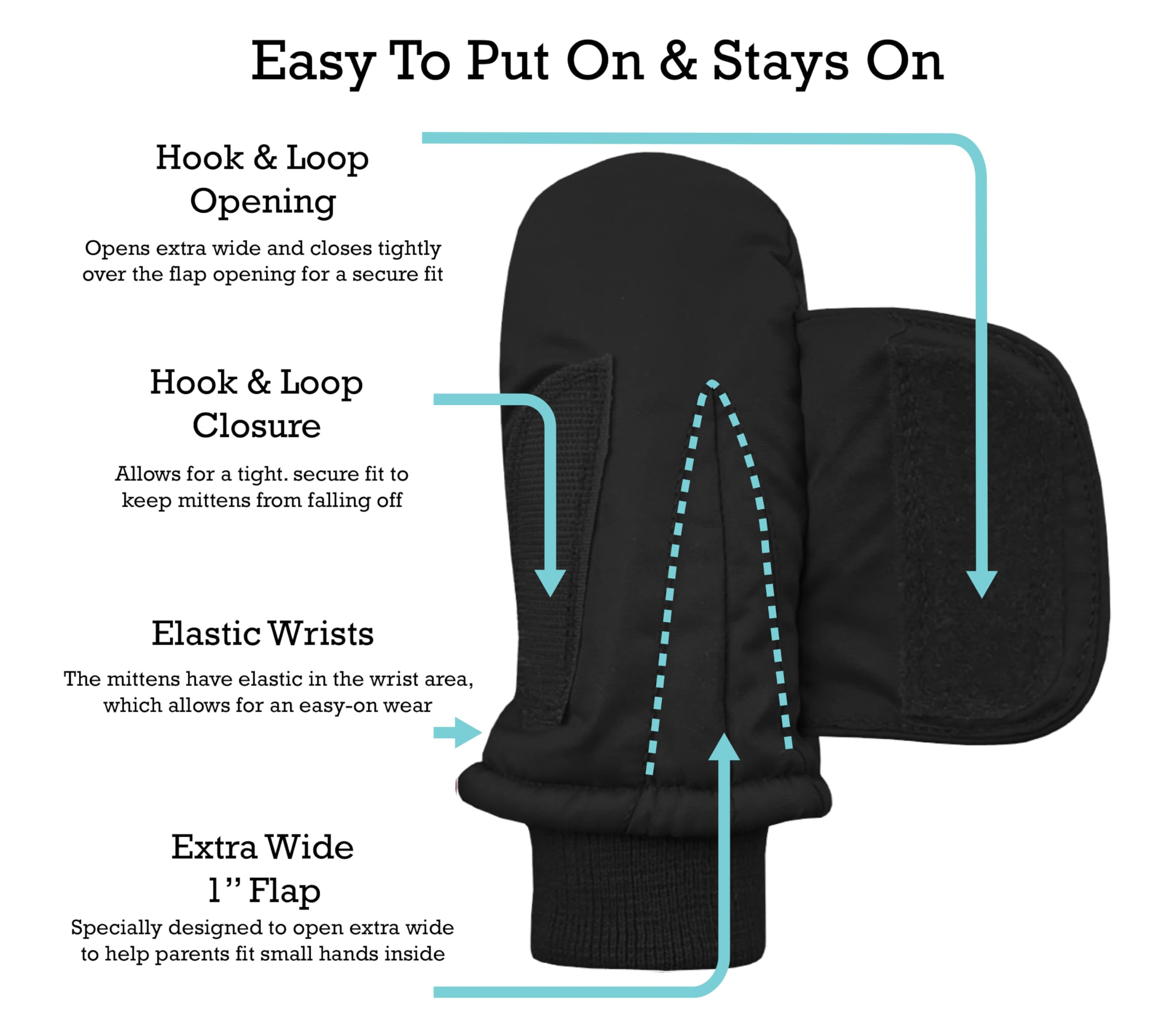 KIDS MITTENS THAT ARE EASY TO PUT ON: The snow mittens are specially designed with a large flap that opens extra wide and there is elastic in the wrist area, which allows plenty of room to fit small hands inside and to find the thumb holes. The hook and loop closure allows for a tight, secure fit. These are great for first-time mitten wearers and little boys, girls, toddlers and infants who love playing outside!