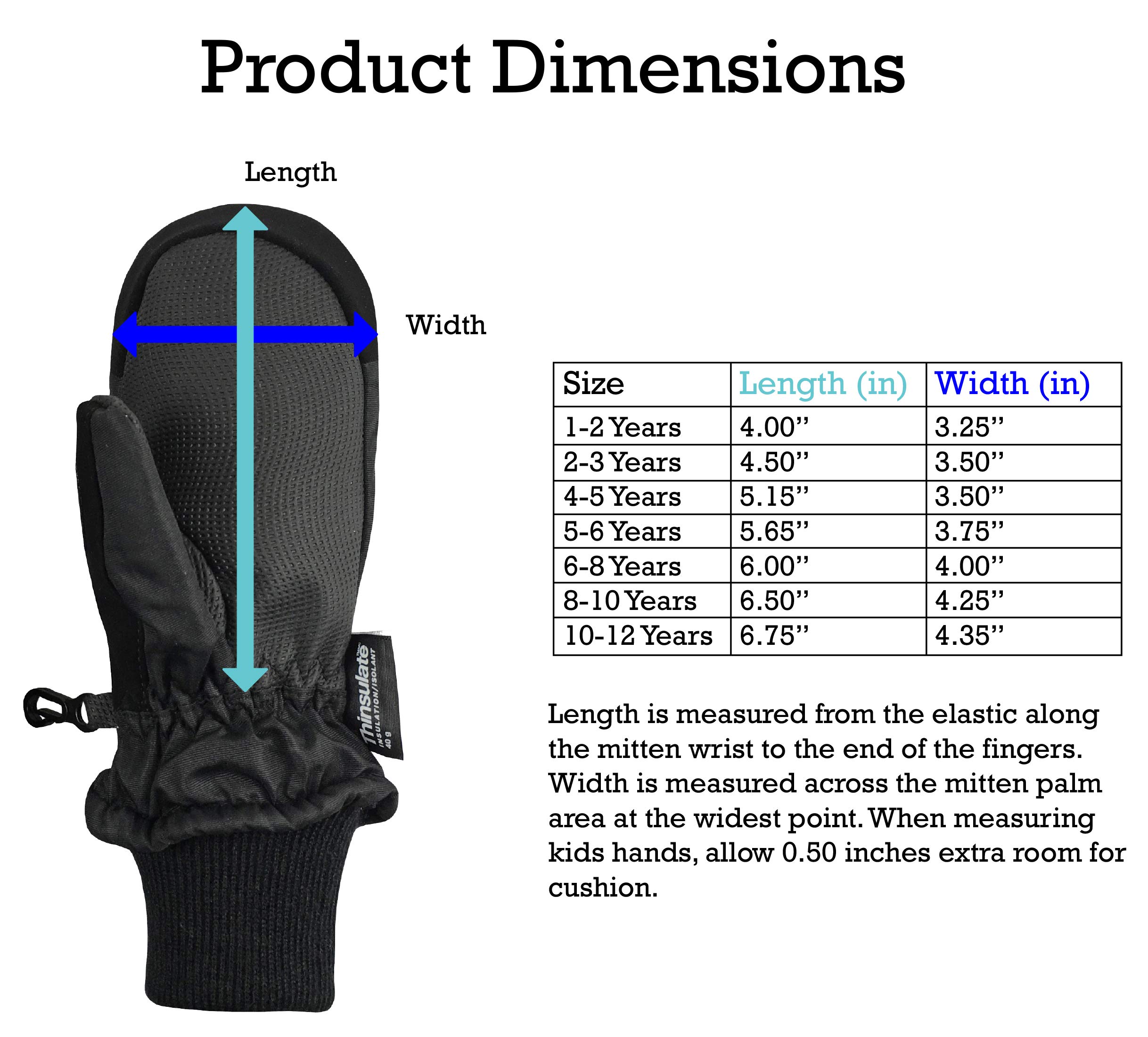 PRODUCT DIMENSIONS: Length (L) is measured from the elastic along the mitten wrist to the end of the fingers; Width (W) is measured across the mitten palm area at the widest point: 1-2 years (4.0" L, 3.25" W); 2-3 years (4.5" L, 3.5" W); 4-5 years (5.15" L, 3.5" W); 6-8 Years (6.0" L, 4.0" W); 8-10 Years (6.5" L, 4.25" W). When measuring kids hands, allow 0.5 inches extra room for cushion.