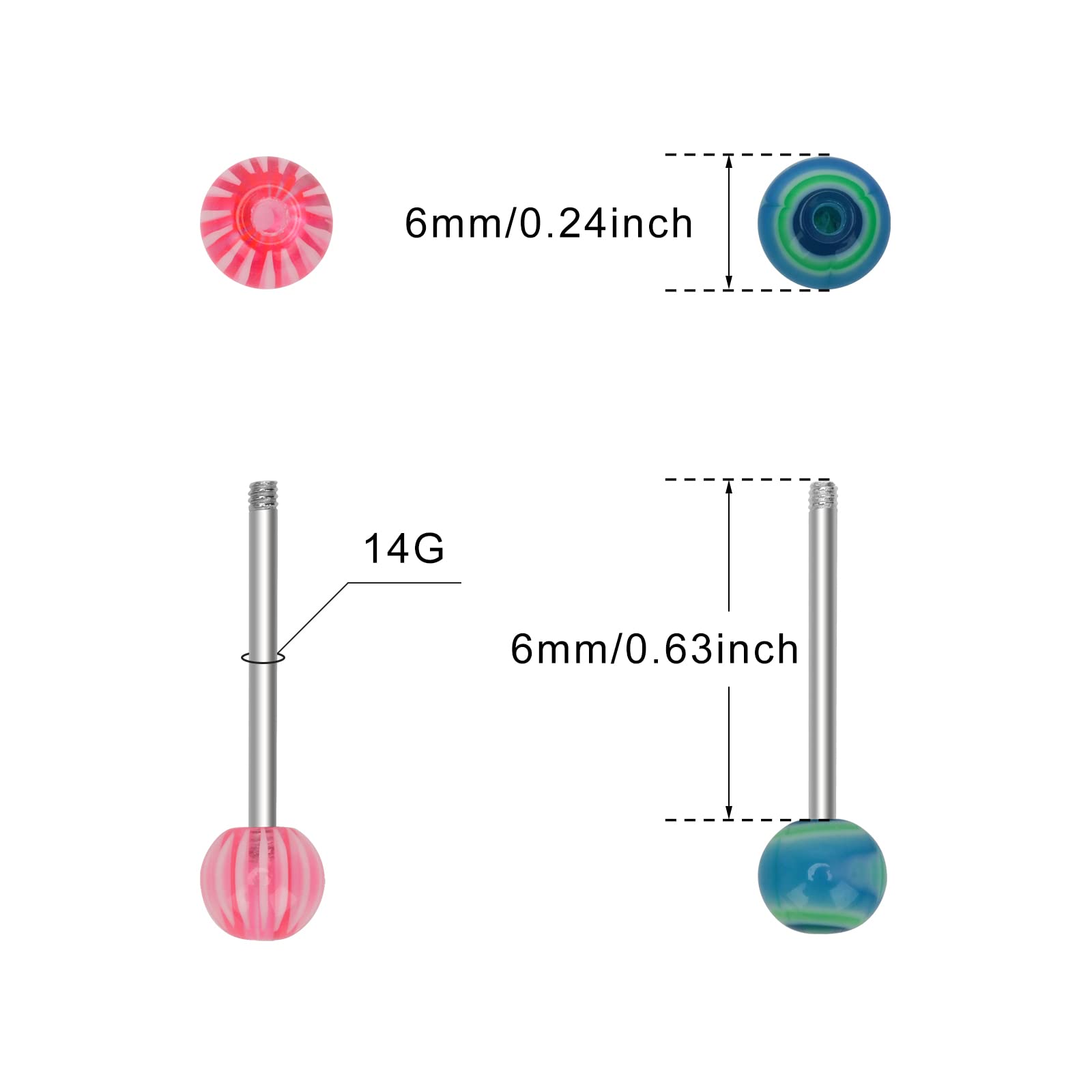 Size: 14G barbell bar tongue ring, length: 16mm/0.63inch, the ball diameter: 6mm/0.24inch, lightweight and soft and comfortable for your daily wearing.