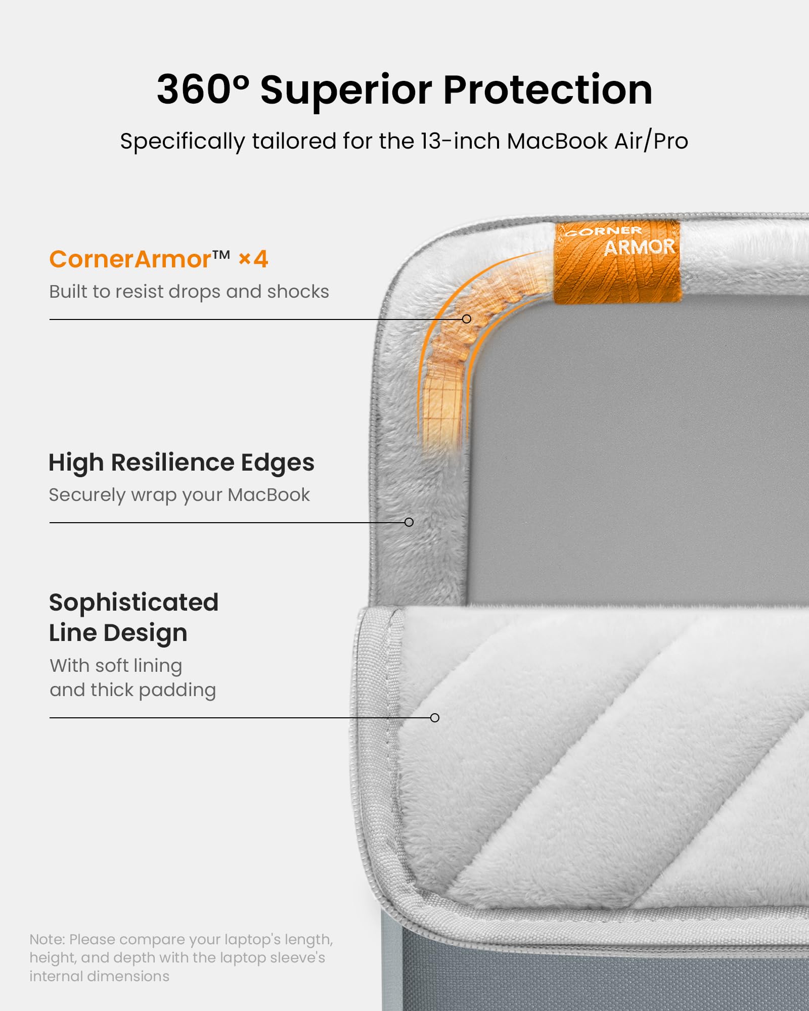 Military-Grade Protection: To combat the toughest situations: from falls to shocks to vibrations, tomtoc proposed the concept of 360 protection and designed the laptop sleeve with CornerArmor Technology, high resilience edges, and high-density soft padding. It passed the Military-Standard-Drop-Test while also maintaining a sleek design