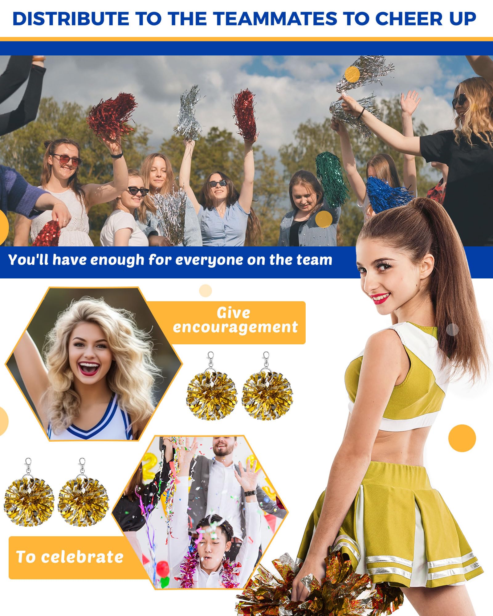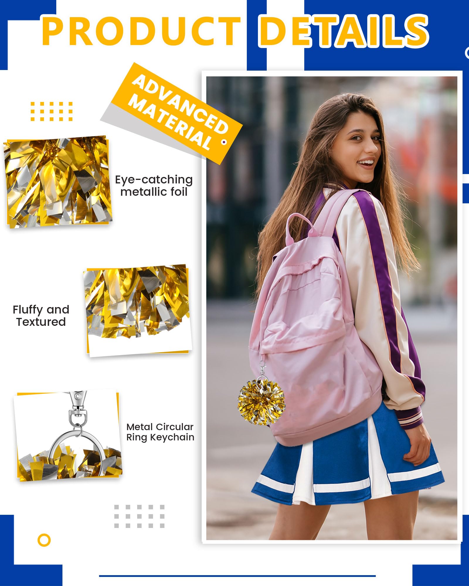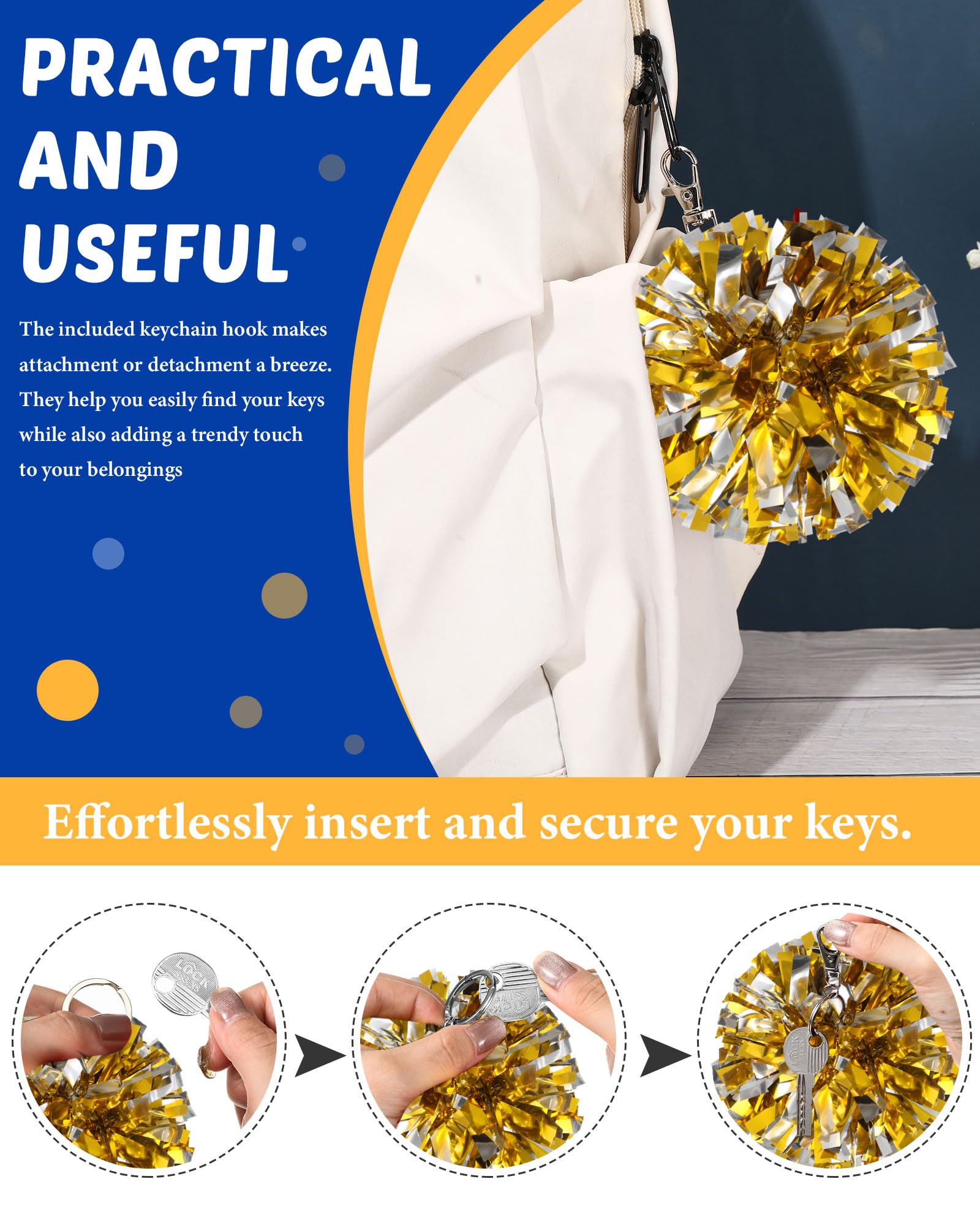 Sturdy Material and Vibrant Colors: these pom pom keychains are made of quality plastic and metal for durability, and feature non fading, shimmering metallic gold silver foil; They catch the eye, boost cheerleading spirit, and show your strong support for the team