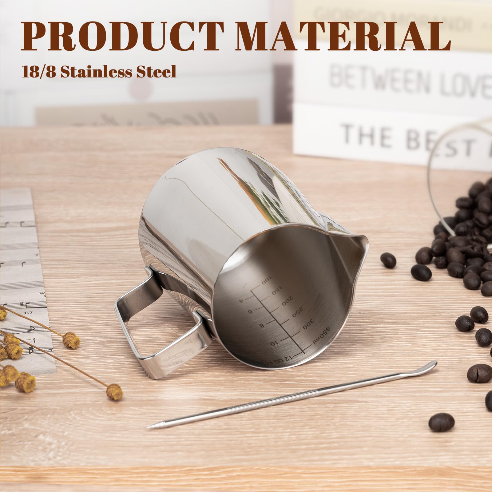 LATTE PEN: Amrules milk frother pitcher comes with a 304 stainless steel latte art pen, which features anti slip design in the middle for an easy grip. You can focus on shaping unique and beautiful patterns on your latte without a trembling hands