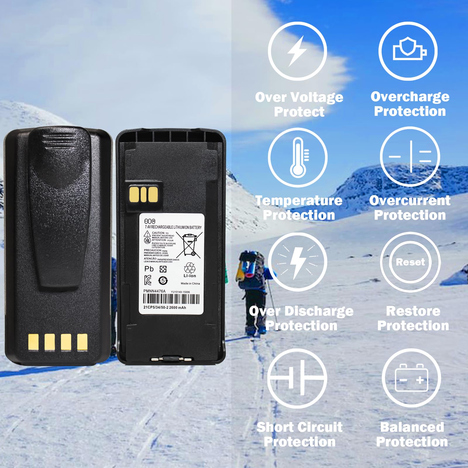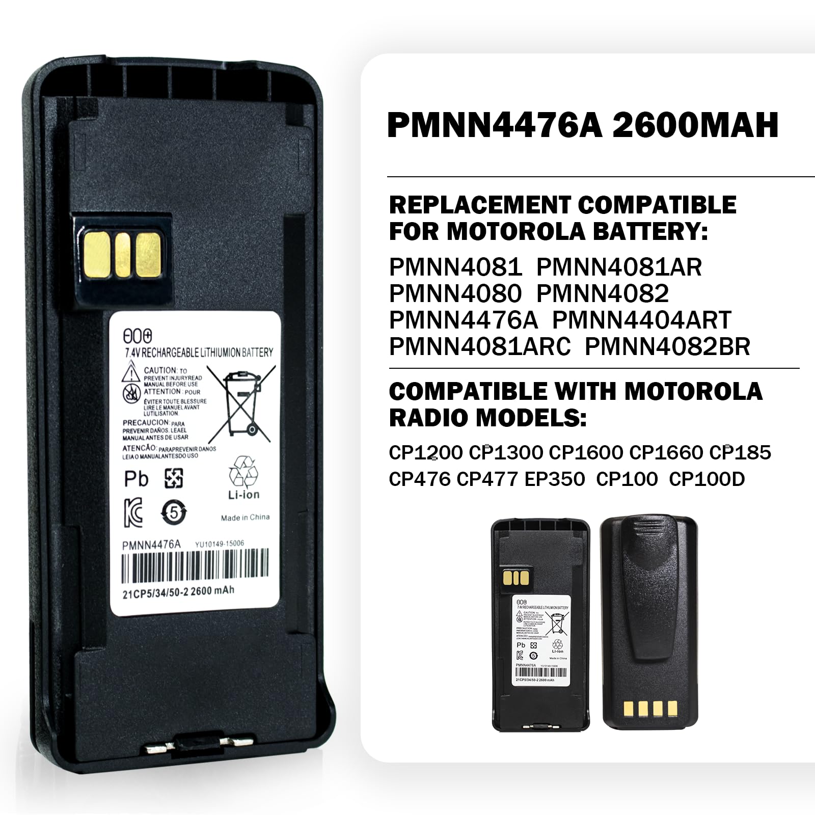 PMNN4476A 7.4V 2600mAh Li-ion Two-Way Radio Rechargeable Battery Replacement for Motorola PMNN4476 PMNN4081 PMNN4080 PMNN4082 PMNN4404 battery