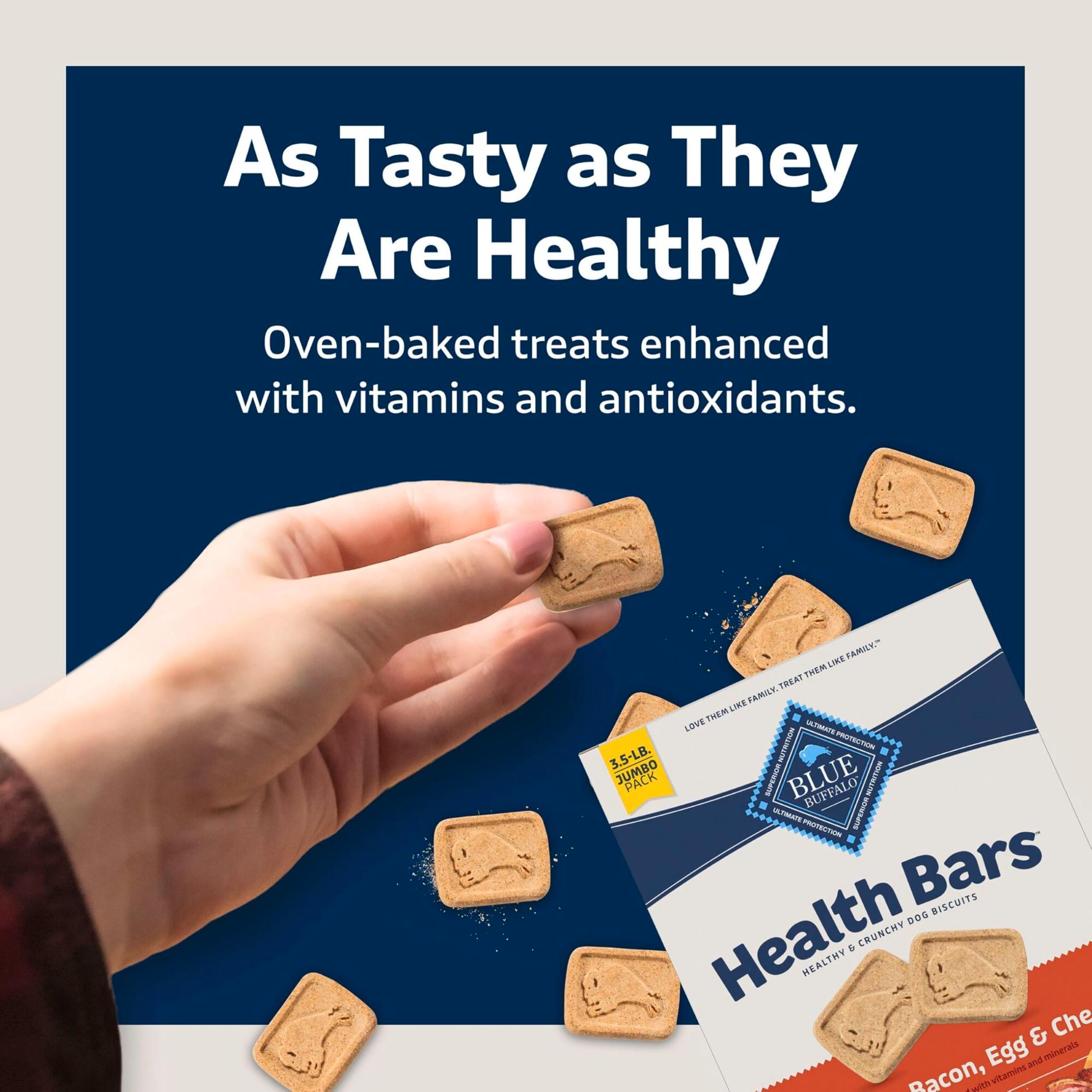 Contains: One (1) 3.5-lb box of BLUE Health Bars Natural Crunchy Dog Treats Biscuits, Bacon, Egg & Cheese