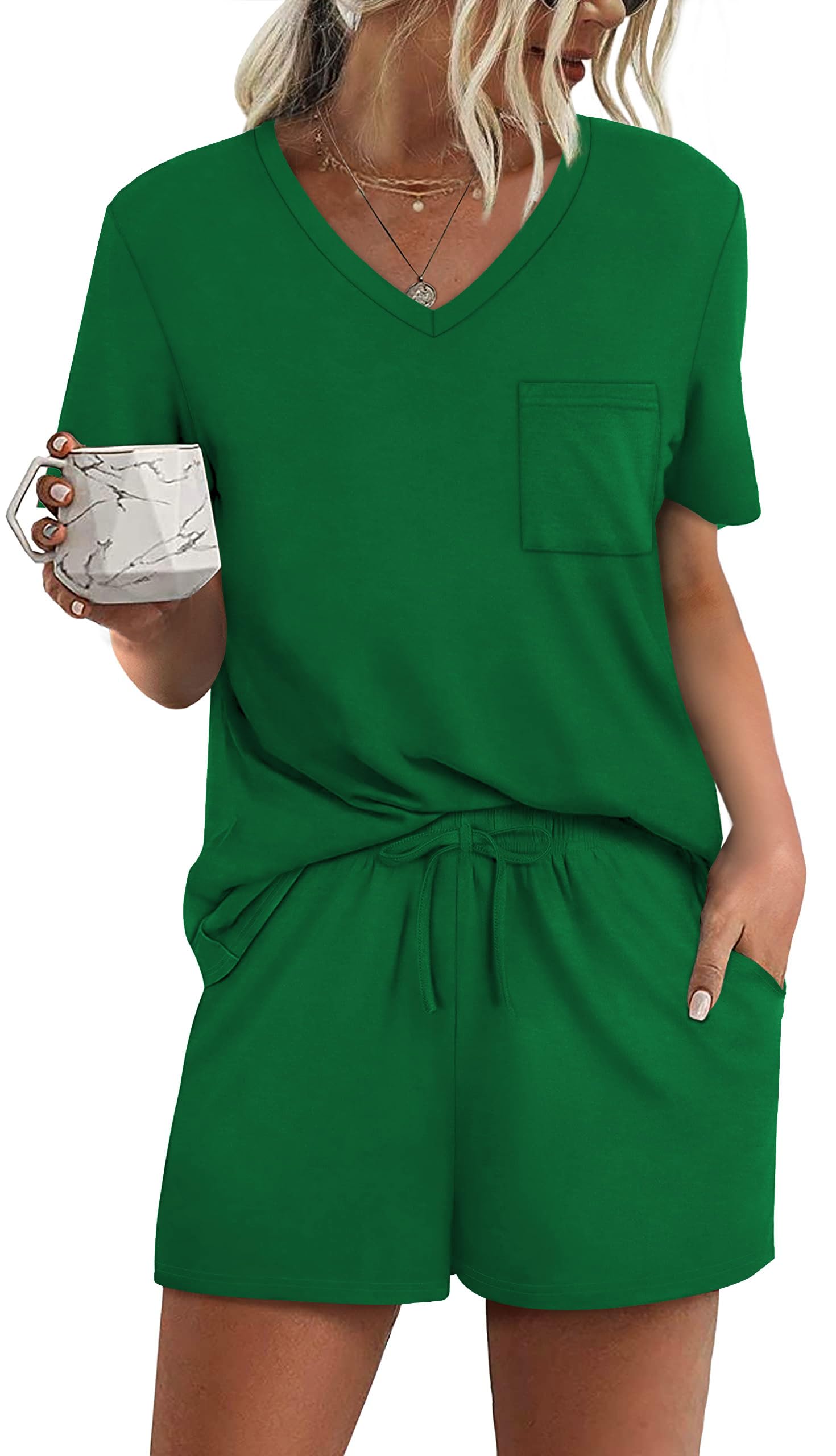 FEATURE --- The package including 1 x short sleeve t-shirt and 1 x short. The top has classic v neckline and a pocket. The short has elastic drawstring and side pockets. The cute top is perfectly complemented by shorts. Casual and sexy in daily life.